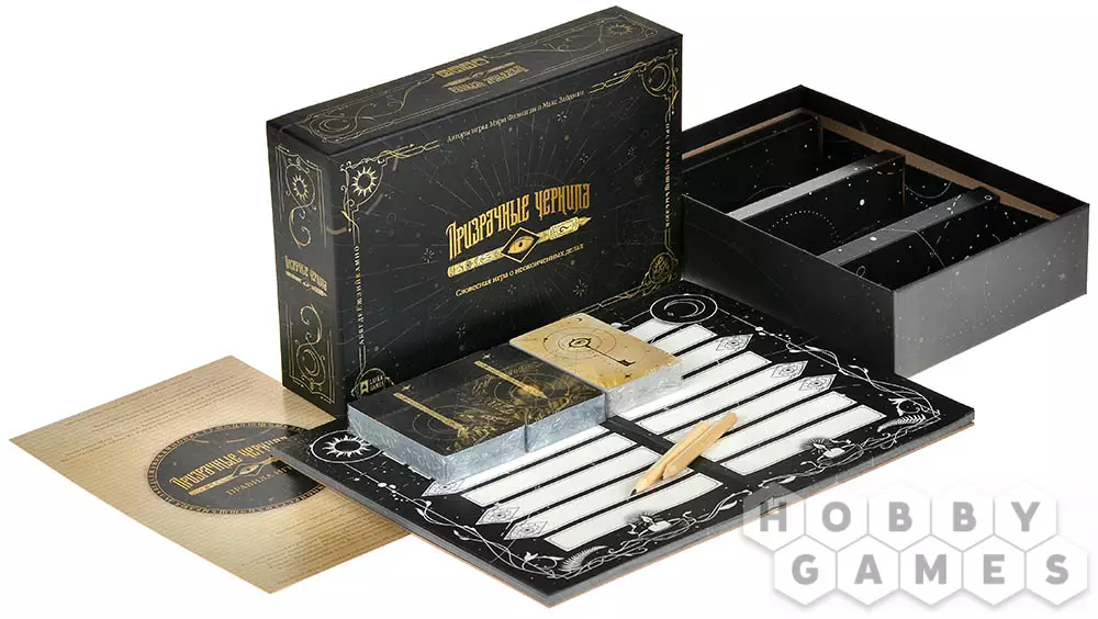 "Призрачные чернила" – это простая и увлекательная игра, в которой игроки поделятся на медиумов и духов. Задача медиумов – угадать, какой объект выбрали духи. Задача духов – с помощью подсказок этот объект описать. Коммуникация между людьми и призраками происходит через планшет спиритического сеанса. Оракулы будут через карты-вопросы уточнять у духов детали, описывающие загаданный предмет, а духи – побуквенно им отвечать, причём ответ может прерваться на любой букве, если команда решит, что ей этого достаточно. Игра продолжается до момента, пока кто-то из медиумов не отгадает выбранный объект.