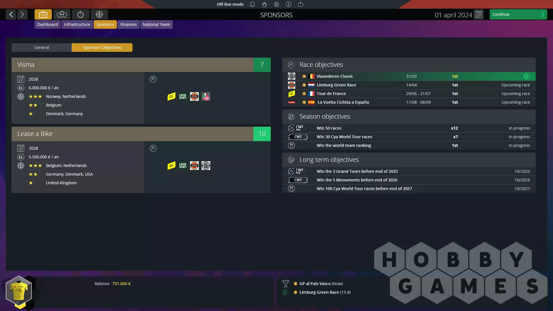 Just like in real life as a cycling sports director, you need to find new sponsors to build your cycling team. You can now partner with multiple sponsors. You must meet the expectations of each sponsor or risk making some of them unhappy with your partnership.