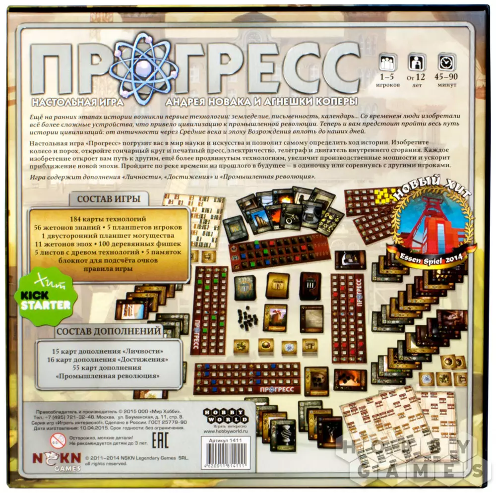 "Прогресс" это карточная игра, которая рассказывает о развитии технологий на протяжении практически всей истории человечества. Игрокам, соответственно, предстоит построить самую технологически развитую цивилизацию, при этом конкурируя друг с другом. Вам предстоит пройти путь от первых творений человечества через античность, средние века и эпоху Возрождения до первых искр промышленной революции (а с дополнением даже немного дальше)! При этом всего в игре три различных ключевых области прогресса – это наука, техника и искусство. Грамотно развивая различные технологии и правильно выбирая стратегию, вы приведёте свою нацию к победе!