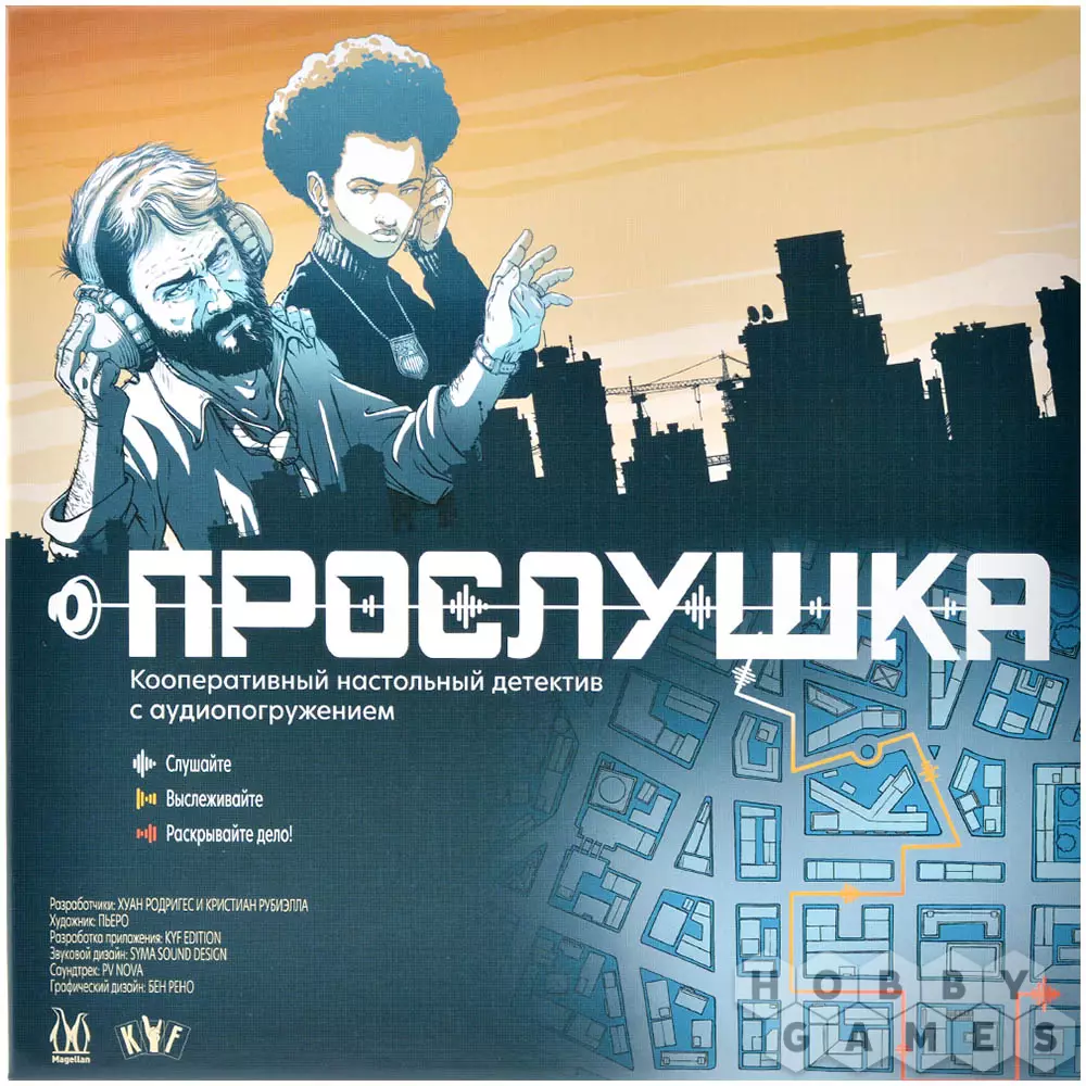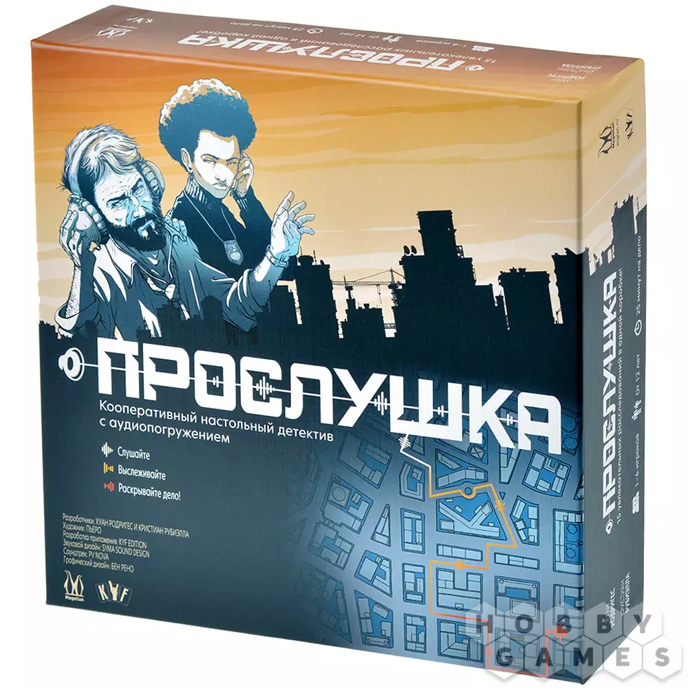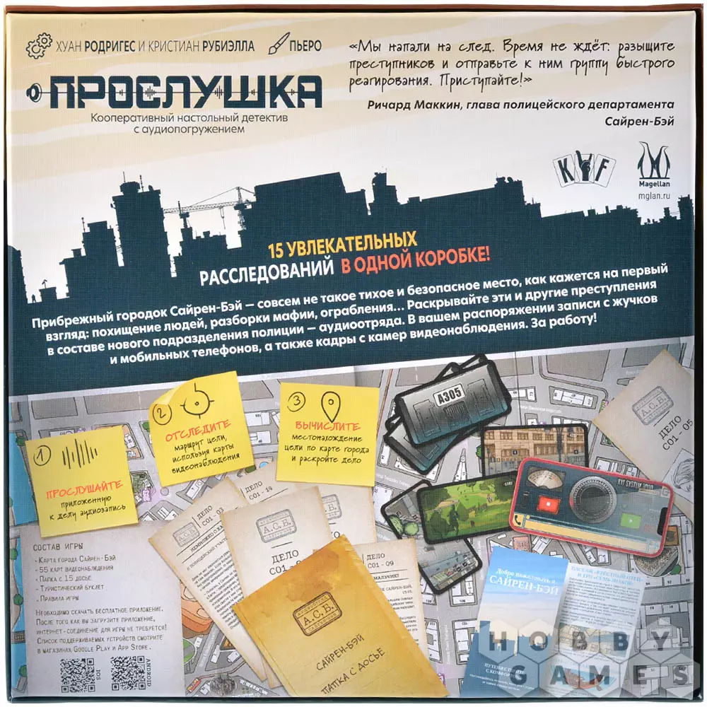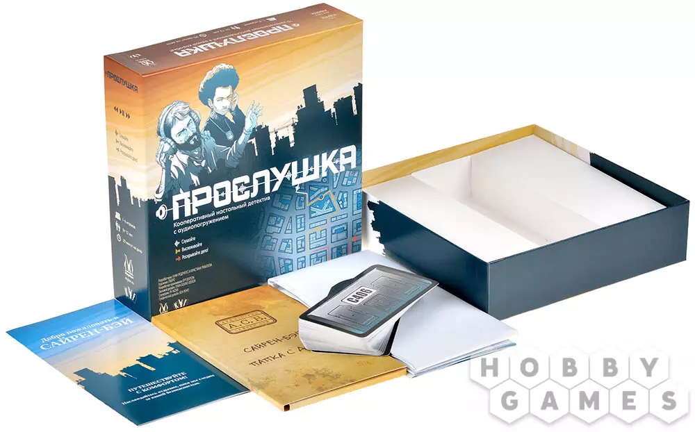 "Прослушка" – это кооперативный настольный детектив, в котором вы и ваши друзья станете следователями особого аудиоотряда. Совместными усилиями вам предстоит провести 15 уникальных расследований, входящих в данную коробку, чтобы вычислить преступников. Но вы сможете раскрывать преступления и в одиночку, если ваши напарники уехали в офис и оставили в отделе одного.