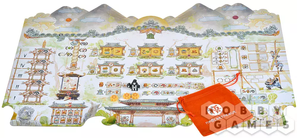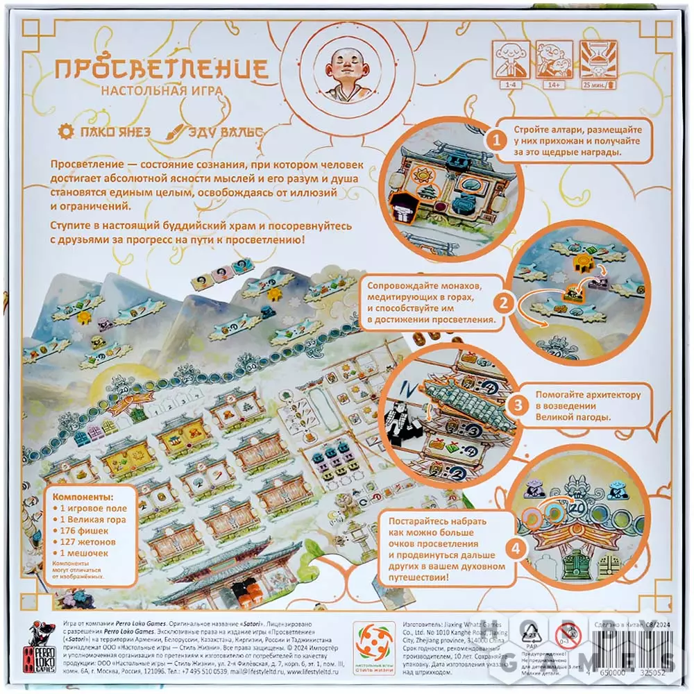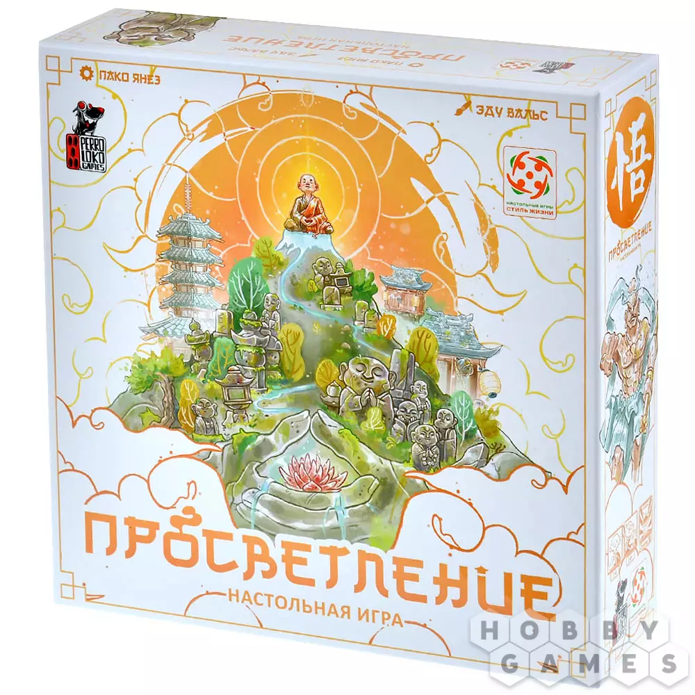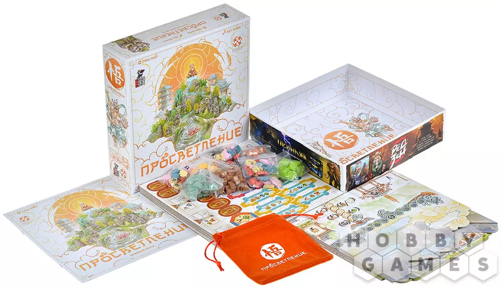 А ещё "Просветление" – это настольная игра, в которой вам предстоит состязаться в продвижении по пути к просветлению. Ваша задача – возводить алтари и направлять к ним верующих для совершения молитв, поддерживать монахов в их стремлении к духовному озарению, а также содействовать архитектору в создании Великой пагоды.