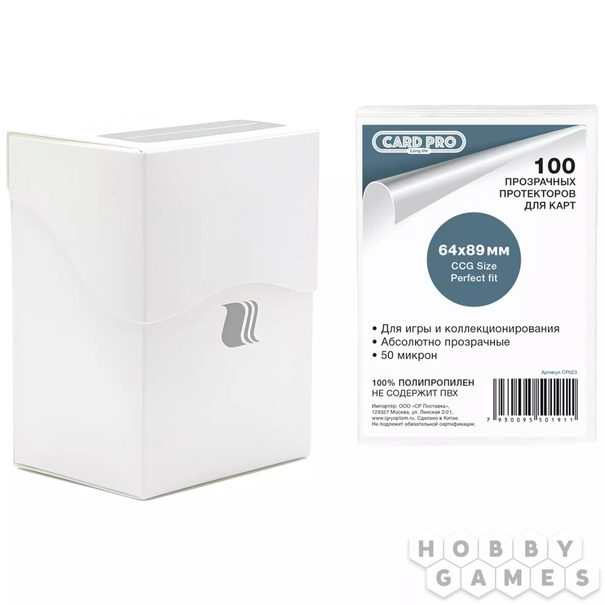 В этом комплкете вы найдёте не только прозрачные протекторы размером 64x89 мм и плотностью 50 микрон, но и не менее полезный атрибут для хранения карт – бокс. Это прочная коробочка из полипропилена, предназначенная для карт размера Standard. Она вмещает до 100 карт в протекторах или до 80 карт в двойных протекторах.
