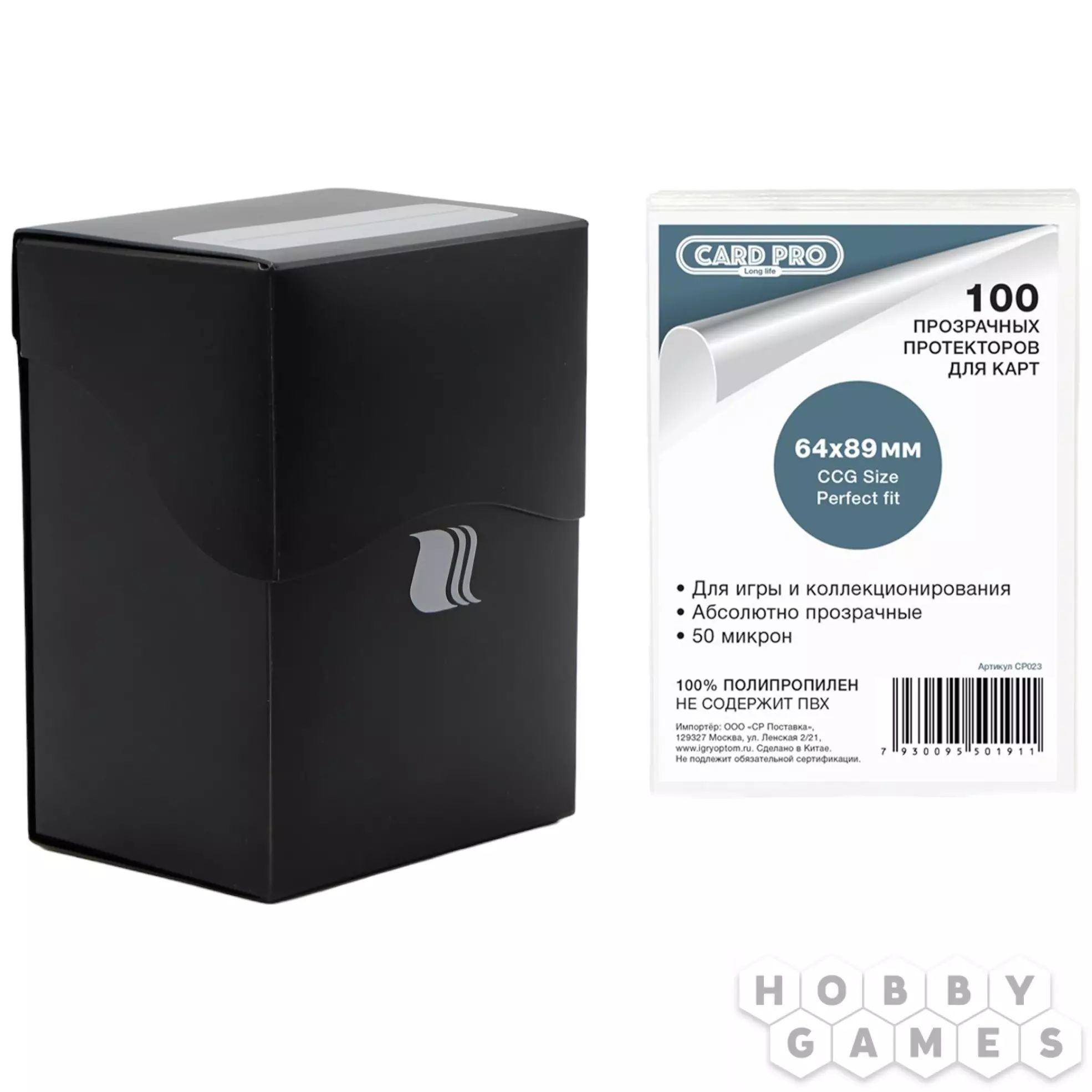 В этом комплкете вы найдёте не только прозрачные протекторы размером 64x89 мм и плотностью 50 микрон, но и не менее полезный атрибут для хранения карт – бокс. Это прочная коробочка из полипропилена, предназначенная для карт размера Standard. Она вмещает до 100 карт в протекторах или до 80 карт в двойных протекторах.