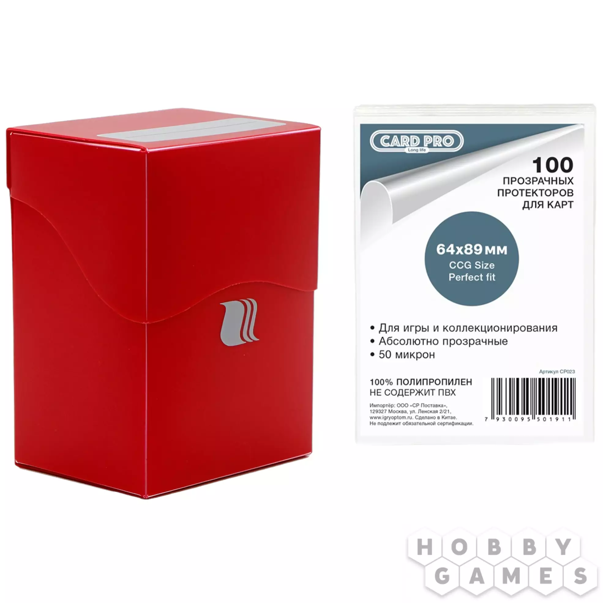 В этом комплкете вы найдёте не только прозрачные протекторы размером 64x89 мм и плотностью 50 микрон, но и не менее полезный атрибут для хранения карт – бокс. Это прочная коробочка из полипропилена, предназначенная для карт размера Standard. Она вмещает до 100 карт в протекторах или до 80 карт в двойных протекторах.