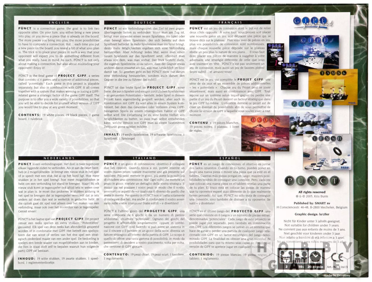 «Пункт» — игра соединения, где противоборство игроков ведётся в трёх измерениях. Цель игры: связать противоположные стороны игрового поля. Проблема: каждая введённая в игру фигура даёт оппоненту намёк на выбранную вами стратегию. Задача: дезориентировать противника, скрывая свой замысел до последней минуты. Итог: одна из наиболее сложных игр серии «GIPF» — для тех, кто не боится думать.