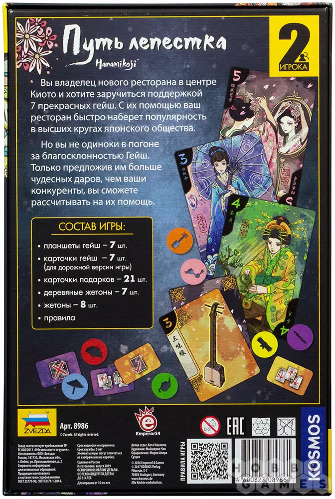 pax21.05.2021 22:28Отличная дуэльная игра. Очень простые правила, всего четыре действия за раунд на каждого игрока. Но каждый раунд эти четыре действия заставляют напрячь мозги. В коробке есть две версии карт гейш (карты и большие жетоны), версию с картами можно легко взять в дорогу.
