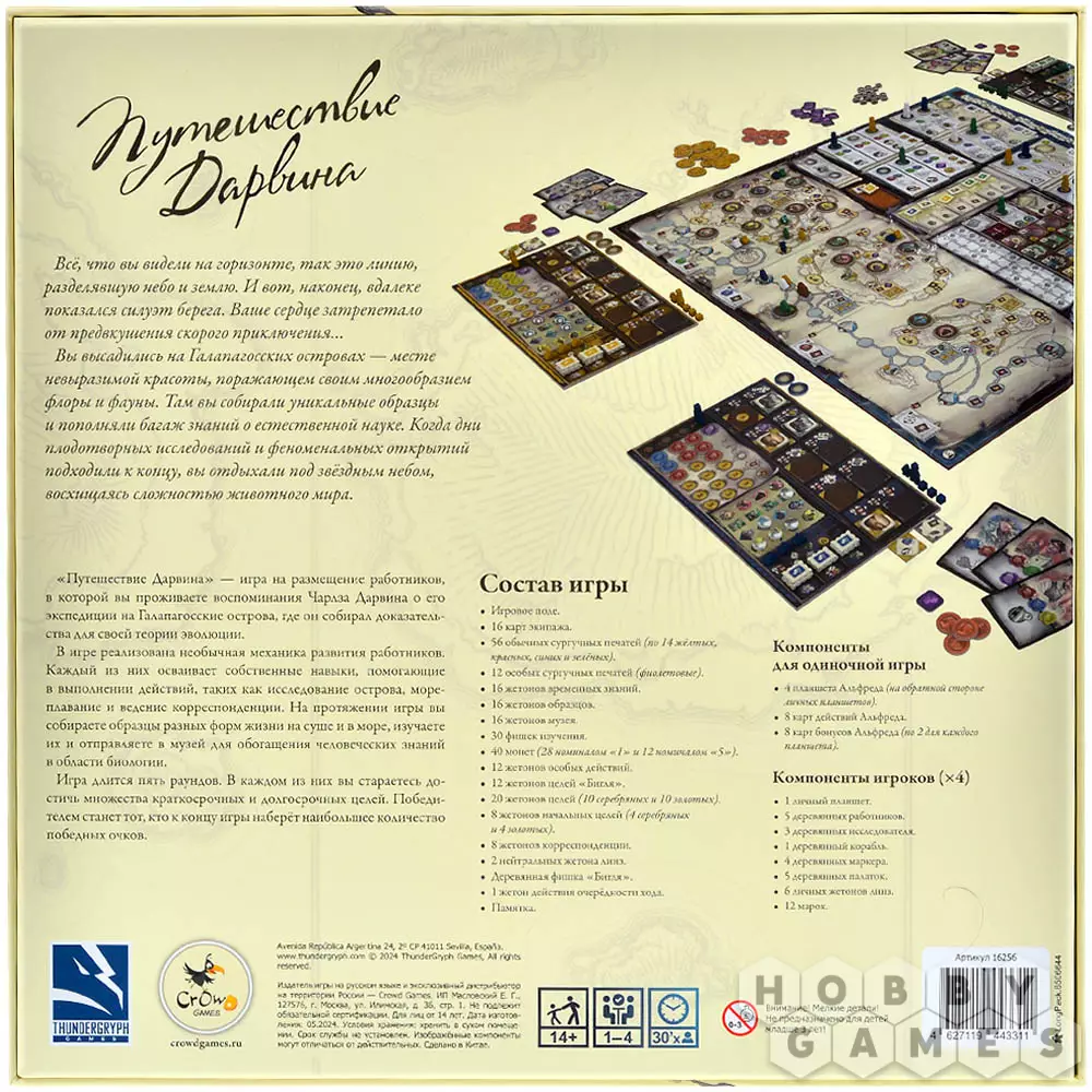 "Путешествие Дарвина" – стратегическая настольная игра для 1-4 участников, в которой вы управляете экспедицией, нанимаете ассистентов, исследуете регионы, собираете редкие образцы и создаёте научные труды. Механика построена на евро-принципах: менеджмент ресурсов, планирование действий и развитие собственной лаборатории. Ассистенты – зоологи, ботаники и другие специалисты – помогают вам открывать новые виды и продвигаться по следу Дарвина. Каждый ваш шаг приближает к победе, но и соперники не дремлют. Пути к успеху разнообразны – выбирайте стратегию, развивайте теории и наблюдайте, как маленькие детали складываются в великое открытие.