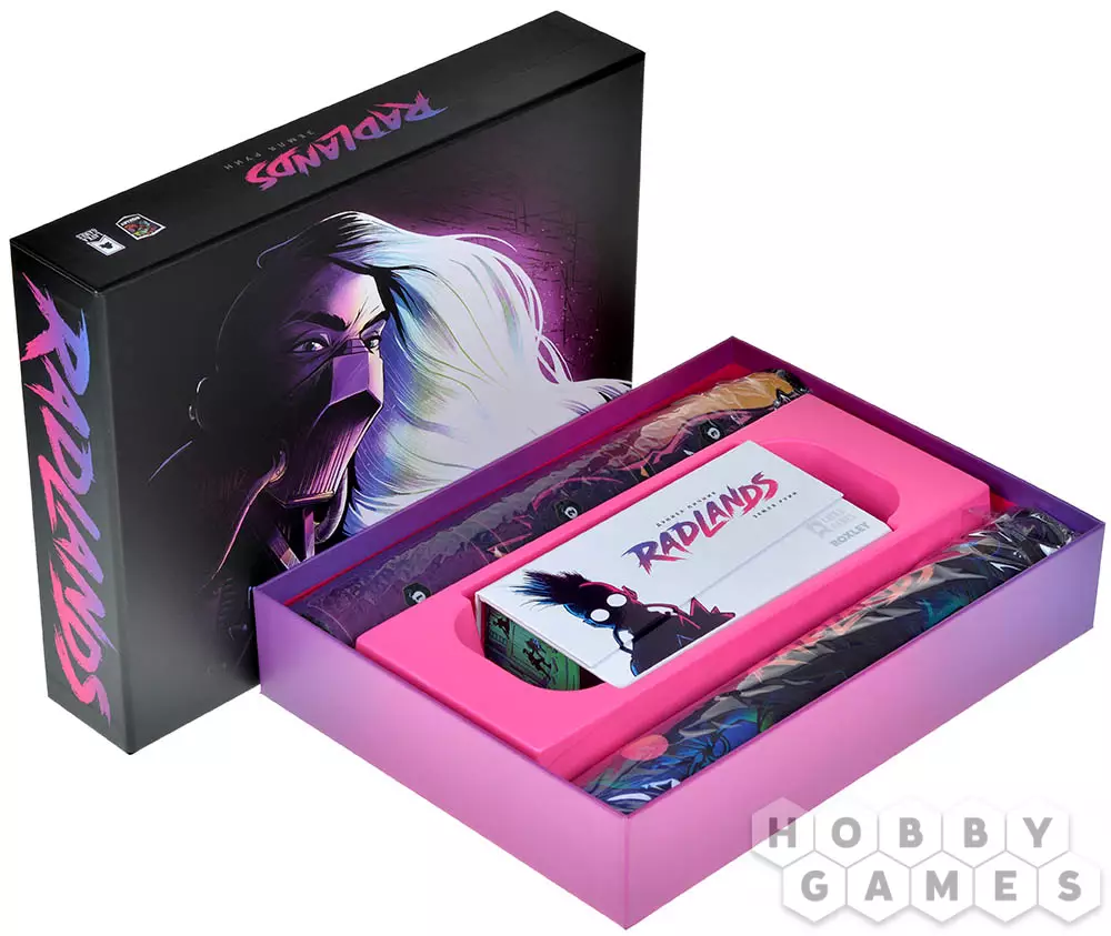 В версии игры "Radlands: Земля руин. Супер Делюкс" вас ждёт большая эффектная коробка, идеально сочетающая в себе функциональность, презентабельность и практичность. Эта версия игры отлично подойдёт любителям стратегии и постапокалиптического жанра в качестве подарка. Внутри все та же компактная складная коробка с магнитным замком, пластиковые карты, тяжёлые пластиковые жетоны воды. Но это не всё! Также вы найдёте два неопреновых коврика, которые создают идеальную игровую поверхность, и пластиковый трей, заботливо хранящий все элементы игры.