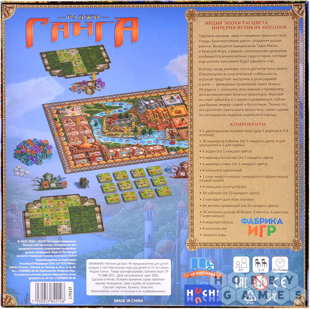 Именно в эту эпоху погружает настольная игра "Раджи Ганга". Игроки примут на себя роль уважаемых правителей своих земель – раджей и рани. Но это уважение невозможно без должной работы, поэтому задачей игроков становится развитие своих территорий из личных имений в потрясающие богатые провинции. Игра длится на протяжении нескольких раундов, в течение которых игроки будут размещать своих рабочих на различные участки игрового поля. Хотите получить больше монет? Отправьте рабочего торговать на рынок. Нужна поддержка? Загляните во дворец Великих Моголов. Получили всё необходимое для облагораживания своей провинции? Пусть рабочие отправляются в карьер и начинают строительство храма.