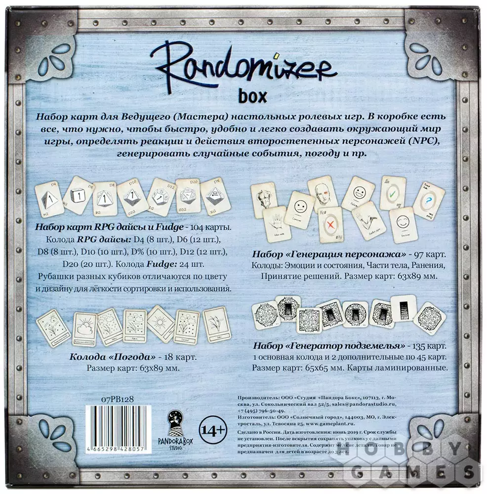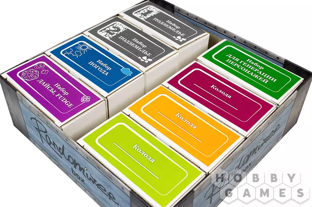 Вы держите в руках уникальную коробку с наборами карт для Ведущего (Мастера) настольных ролевых игр – Рандомайзер Бокс (Randomizer Box). С помощью этих наборов Ведущий (Мастер) может легко и быстро создавать на ходу или заранее окружающий мир и персонажей в игре, определять реакции, мотивы и действия второстепенных персонажей (NPC), генерировать случайные события, погоду, подземелья и тому подобное.