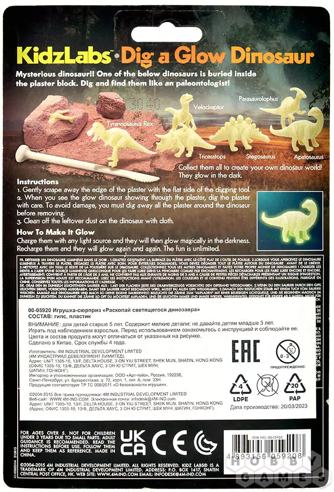 "Раскопай светящегося динозавра" – это набор, благодаря которому дети смогут примереть на себя роль настоящего учёного! В составе вы найдёте гипсовый брикет в форме яйца, а также инструмент, необходимый для раскопок, – молоточек с пилой на обратной стороне. А внутри яйца – коллекционная фигурка динозавра, которая светится в темноте. Почему коллекционная? Потому что внутри каждого "доисторического яйца" спрятан свой маленький динозаврик. Собрав несколько разных доисторических ящеров, у вас получится самая настоящая палеонтологическая выставка!