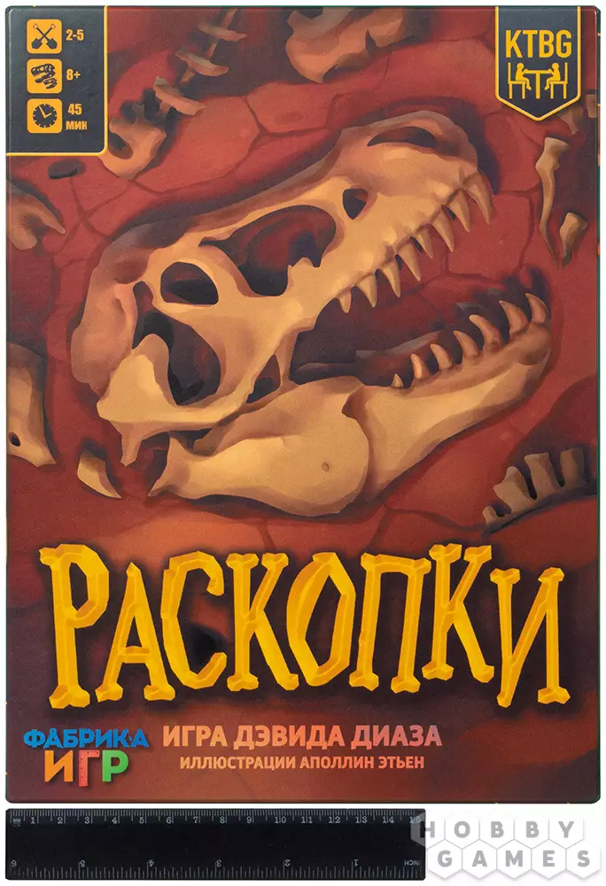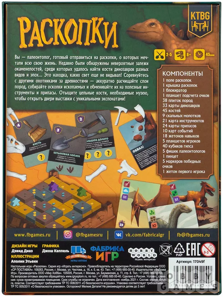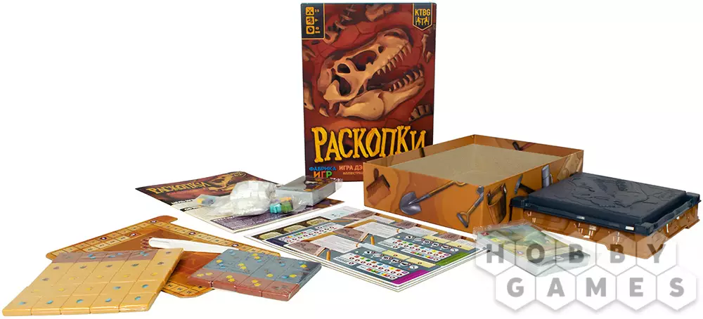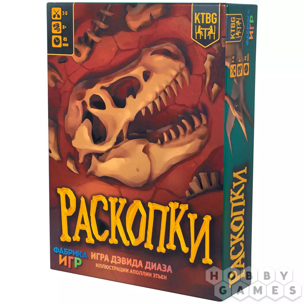 В настольной игре "Раскопки" игрок берёт на себя роль палеонтолога, целью которого становится найти как можно больше ценных останков. В свой ход игрок перемещает свою фишку по объёмному полю раскопок, составленному из блоков – различных пород, среди которых песок, глина и камни. Эти блоки необходимо двигать, чтобы расчистить поле раскопок. При этом действии затрачивается сила палеонтолога: её количество и количество плиток, которые одновременно можно подвинуть, зависит от веса породы. Во время раскопок игрок будет находить не только останки динозавров, но и различные ценные осколки ископаемых, которые приносят победные очки и обмениваются на рынке на полезные инструменты. А собранный целиком скелет динозавра принесёт дополнительные очки!