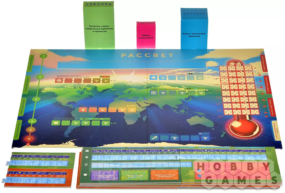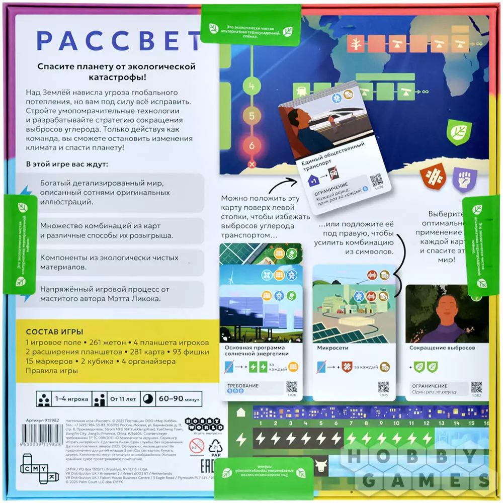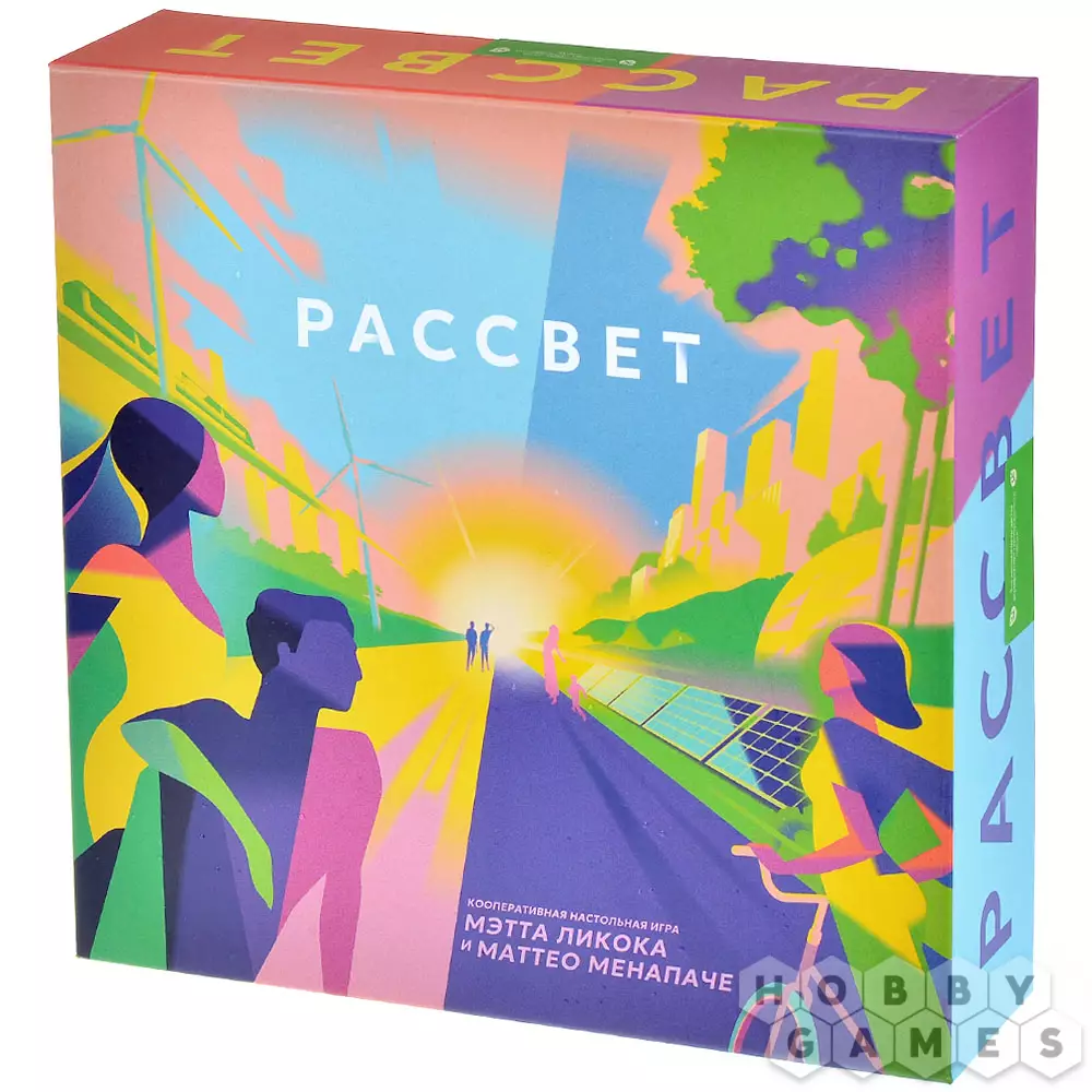 "Рассвет" – кооперативная стратегическая игра от Мэтта Ликока, создателя "Пандемии", в которой вы будете управлять мировыми державами и стремиться спасти планету от климатической катастрофы. От лица Китая, Европы, США или мирового большинства вы будете преследовать главную цель – сократить углеродные выбросы, прежде чем Земля перегреется или города охватит кризис. Игра очаровывает потрясающими иллюстрациями и компонентами из – разумеется! – экологически чистых материалов. Вас ждут мощная колода карт и сложные решения, где важно не только думать на два шага вперёд, но и помогать друг другу.