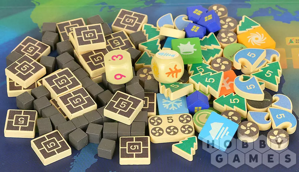 В следующей фазе – фазе выбросов – игроки считают, сколько углерода произвели за раунд, и пытаются нейтрализовать его при помощи деревьев, океанов и новых технологий. Всё, что нейтрализовать не удалось, повышает глобальную температуру. Если столбик термометра заполняется – на поле появляется жетон температуры, и игра становится сложнее, что вы в полной мере прочувствуете на следующем этапе.