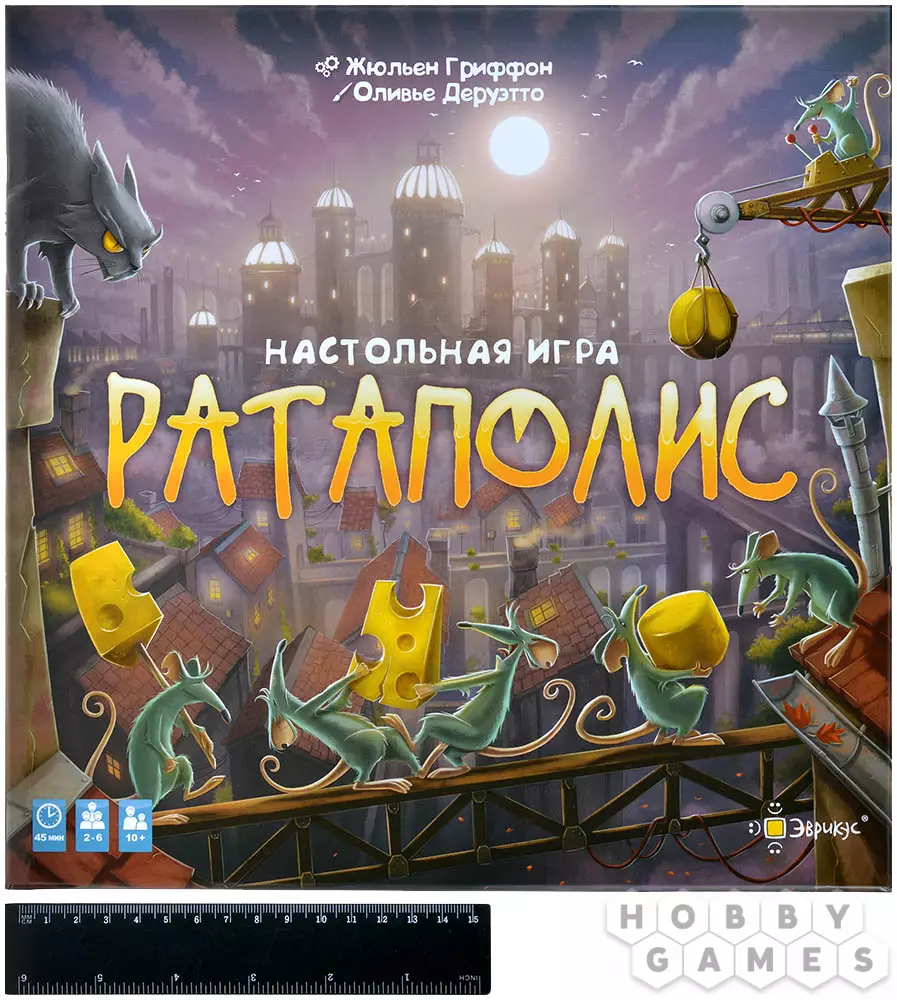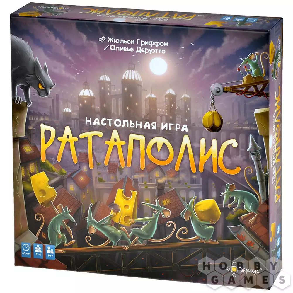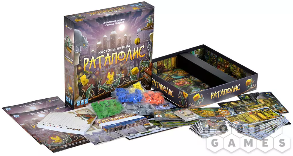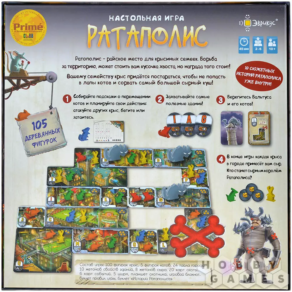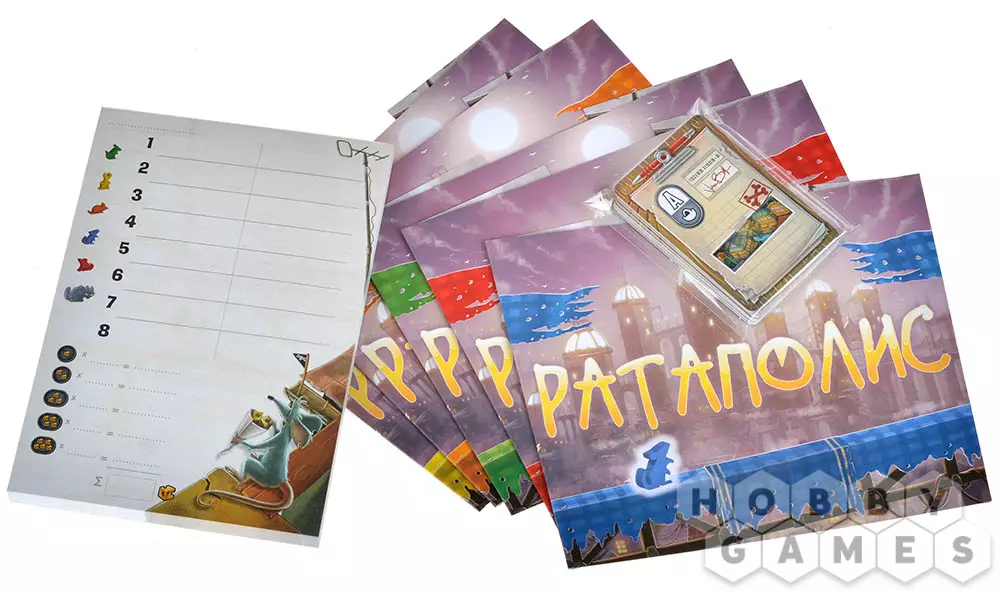 "Ратаполис" – это настольная игра, в которой вам будет нужно хорошо прятаться от крысолова. Однако каждой ваше действие будет сопряжено с риском: остаться в уже знакомом вам районе, или перебраться в другой, вытесняя оттуда другую семью крыс? Но получится ли у вас их вытеснить или вам дадут отпор, будет зависеть от вашей стратегии. Ваши крысы могут быть повсюду, они маленькие, хитрые и всё, всё слышат! В начале хода все получают карты охоты, поэтому каждый игрок знает, в каком районе города могут объявиться коты крысолова. И уже исходя из этой информации планировать свои действия. А действия, кстати, игроки выполняют одновременно, предварительно спланировав их втайне друг от друга: для этого используются листы с ячейками действий и ширмы, которые закрывают листы игроков. Вы можете переместить всю группу крыс, атаковать вражескую крысу или бездействовать, оставшись скрываться в насиженном месте.