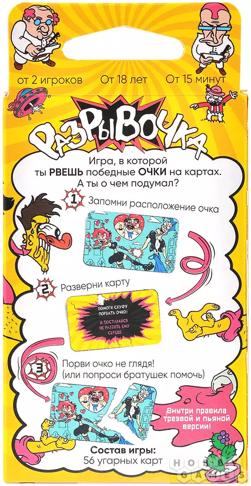 "Разрывочка" – это та самая настолка-мечта любой компании, что просто хочет хорошо провести время и от души посмеяться. Здесь вам не придётся думать – только рвать картинки и иногда выпивать (а может, и часто – всё зависит от вас и ваших действий!). Игра одноразовая, так что хорошенько рассмотрите яркие иллюстрации прежде, чем перейти к уничтожению очка: больше насладиться рисунками не получится. Ну если только вы не испытываете слабость к пазлам...