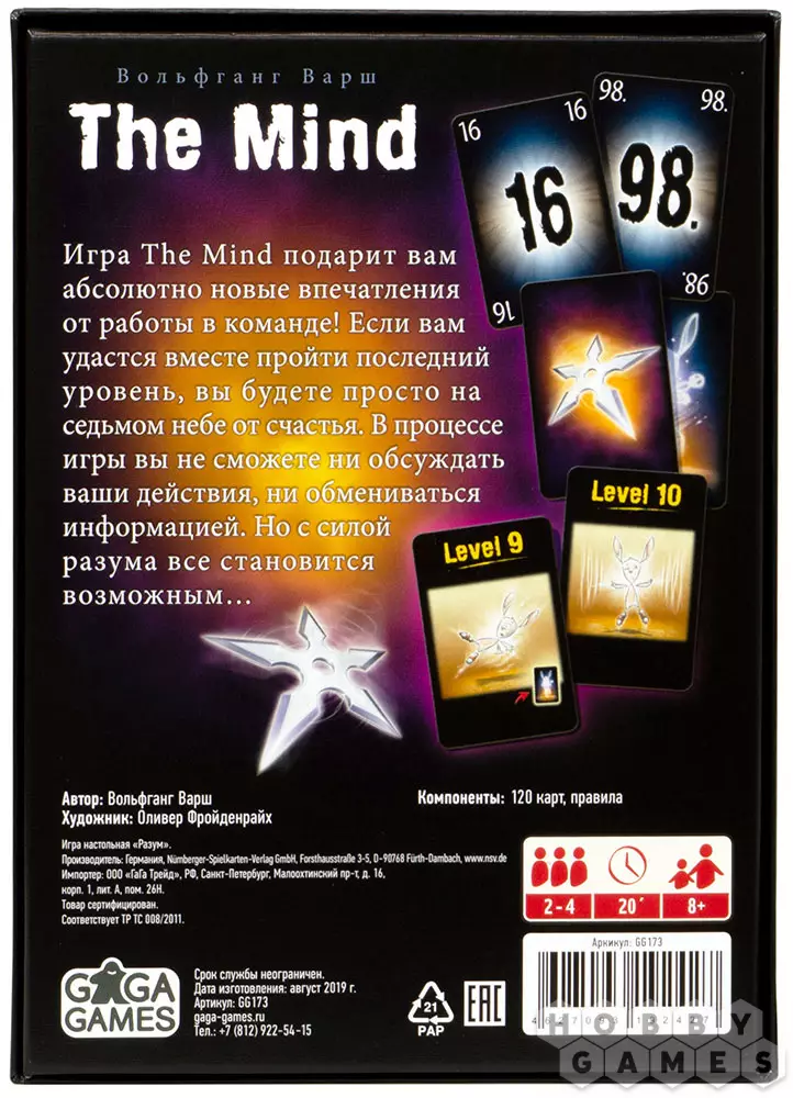 Итак, играть в "Разум" могут от двух до четырёх человек, а одна партия длится от двадцати минут. В комплекте с игрой вы найдёте карты с номерами от 1 до 100, 12 карт уровней с соответствующими наградами, которые игроки получают, завершив тот или иной уровень. Также в коробке есть карты жизней и сюрикенов.