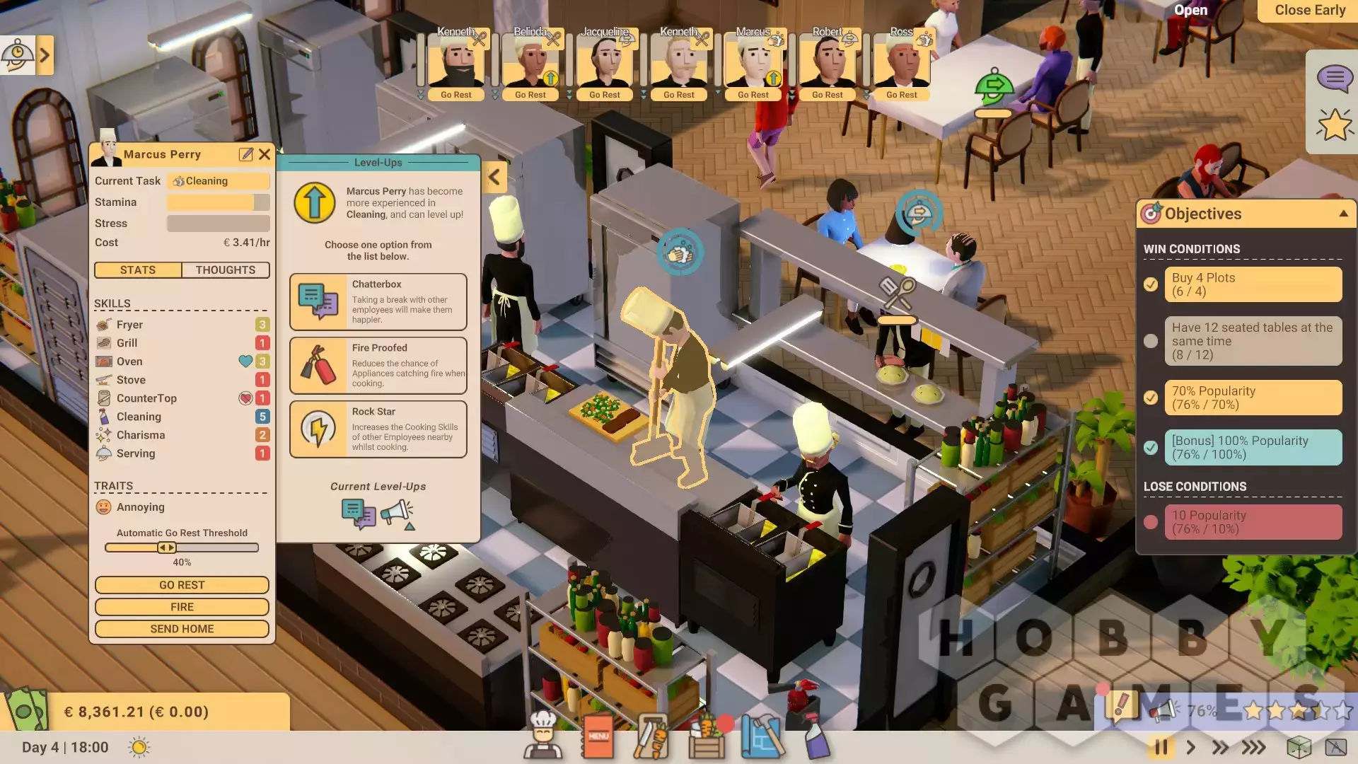 Выберите из пула процедурно сгенерированных кандидатов. Рассмотрите уникальное сочетание черт характера и уровня навыков каждого человека, а также оцените как это может повлиять на эффективность их работы, поведение и взаимодействие с клиентами. Смогут ли они преуспеть? Или окажутся более проблемными, чем того стоят? Управляйте настроением и выносливостью своей команды, чтобы свести к минимуму риск нервных срывов и уходов во время обслуживания. Некоторые сотрудники будут очень любить задания, которые вы им даете, а другие будут их ненавидеть!