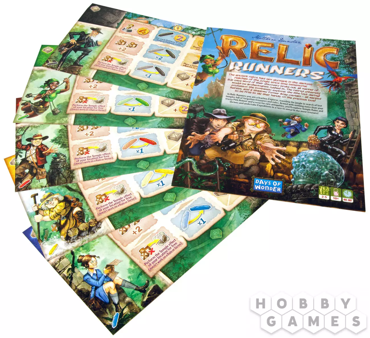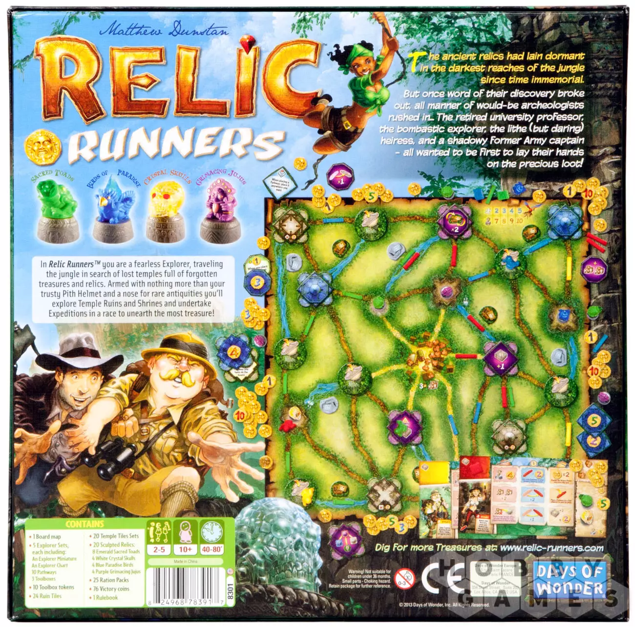 В настольной игре "Relic Runners" вы – бесстрашный исследователь, пробирающийся сквозь джунгли в поисках заброшенных храмов, полных сокровищ и реликвий прошлого. Вооружившись пробковым шлемом и чутьем на антиквариат, вы будете исследовать руины храмов и святилищ. Для этого надо снаряжать целые экспедиции, а затем пытаться наперегонки с соперниками отрыть как можно больше сокровищ!