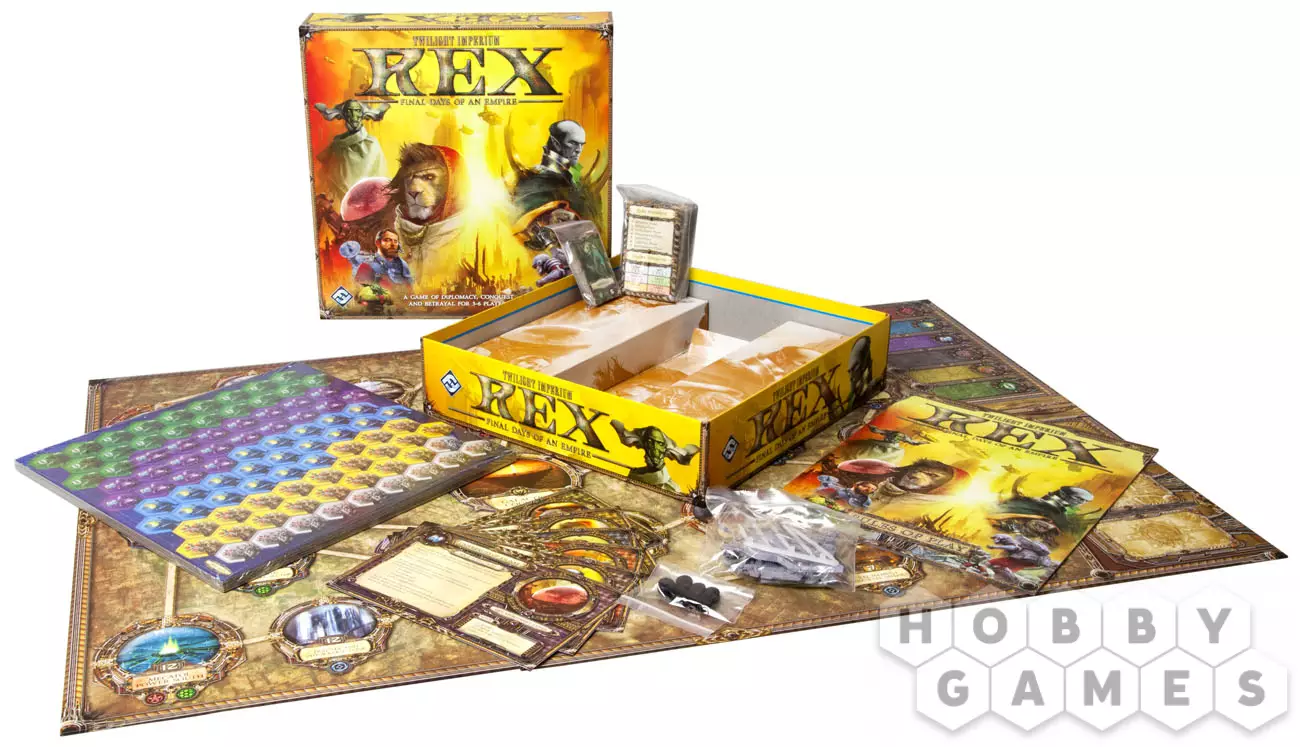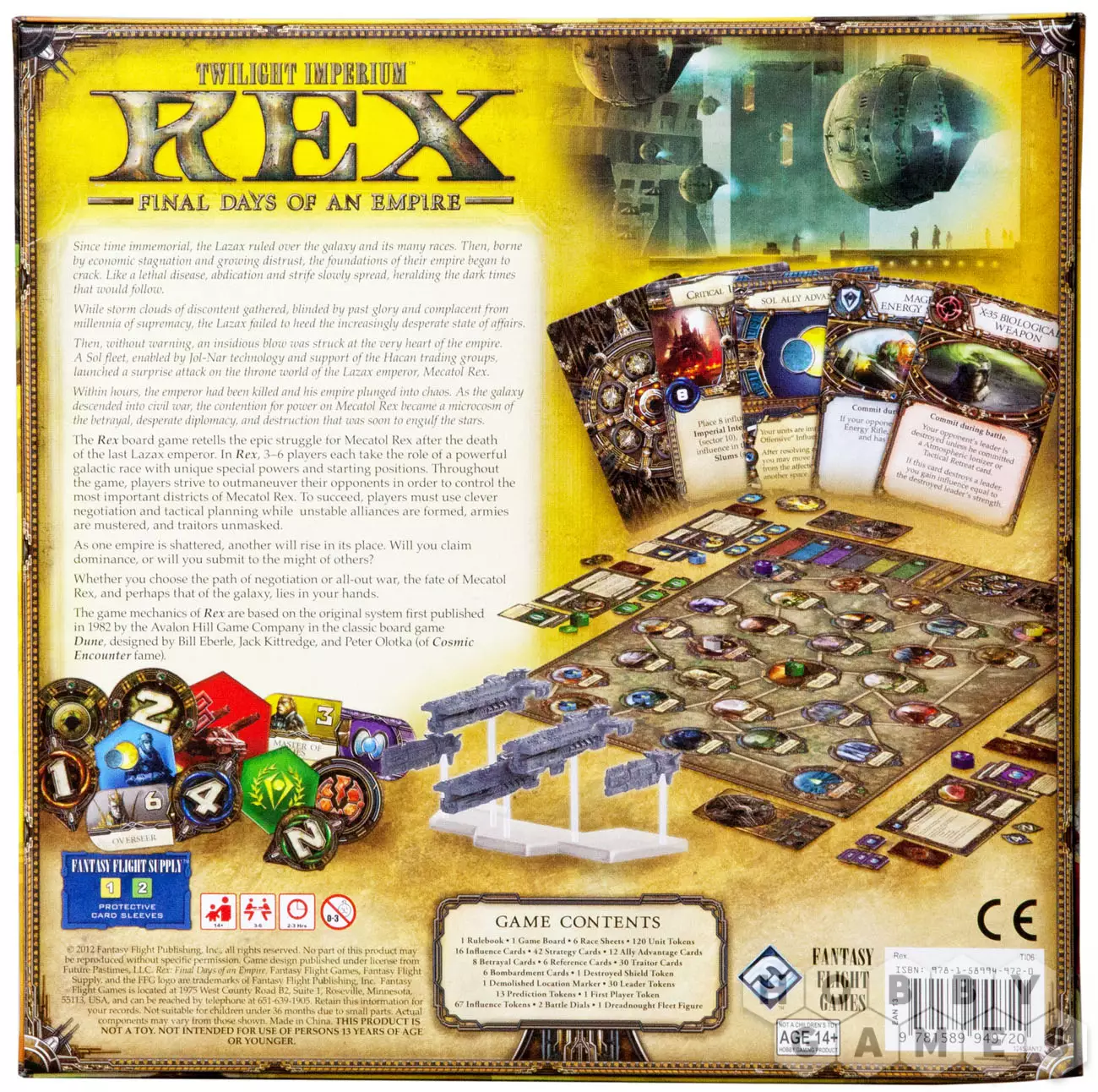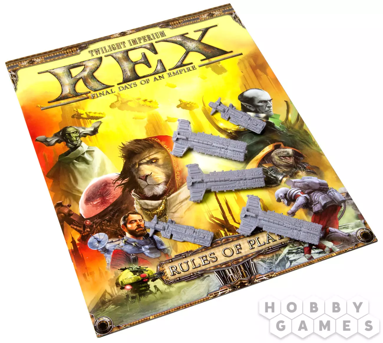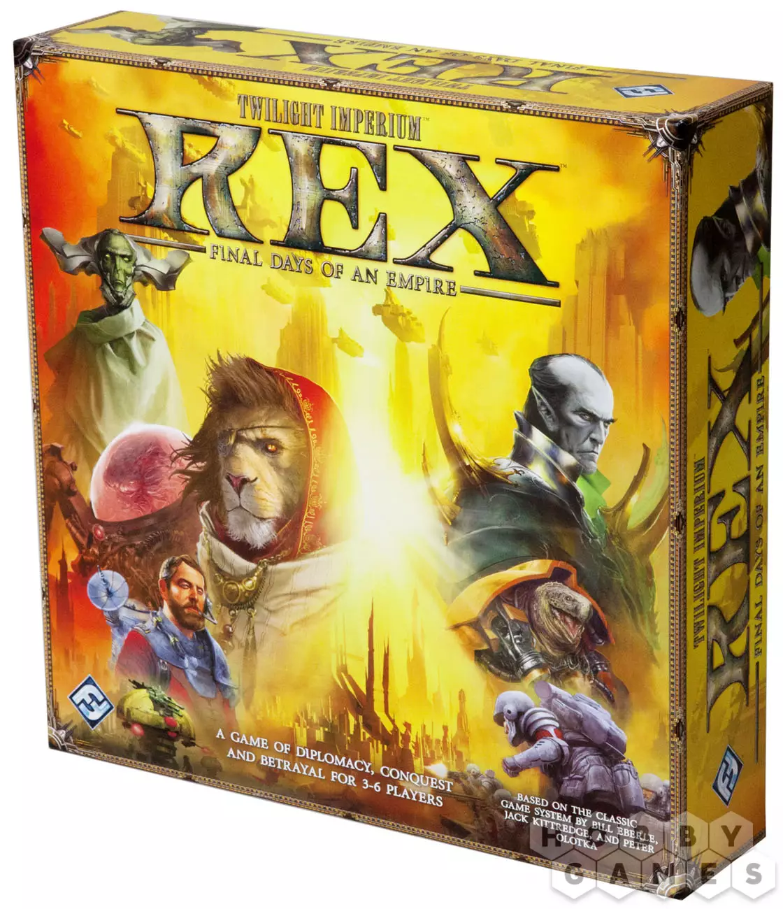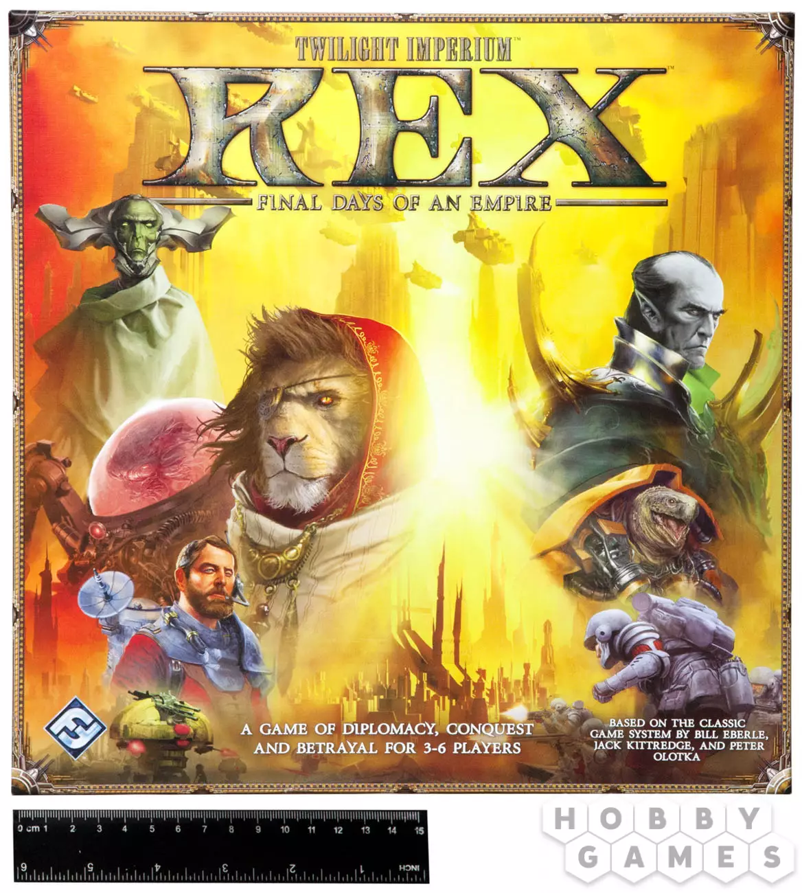 Настольная игра Rex представляет собой переосмысленную версию настольной игры Dune 1979-го года выпуска во вселенной Twilight Imperium от FFG. Это игра переговоров, предательств и войн; в которой от 3 до 6 игроков смогут взять под свой контроль великие межзвёздные цивилизации, конкурирующие за господство над имперским городом. Действие игры происходит за 3000 лет до событий Twilight Imprerium – REX рассказывает о последних днях империи Lazax, и представляет игрокам абсолютно непохожие друг на друга расовые способности и захватывающие возможности для дипломатии, хитростей, и тактического мастерства.