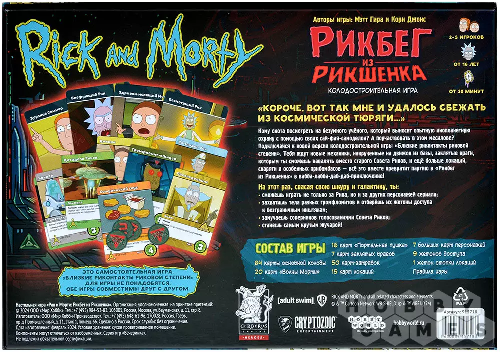 Если вы фанат мультсериала, то, конечно же, догадались, что действия настолки "Рик и Морти: Рикбег из Рикшенка" переносят нас в первую серию третьего сезона, в которой громфломиты пытаются вызнать у Рика секрет его портальной жидкости. Стоит отметить, что это – новая версия уже знакомой фанатам вселенной игры "Близкие риконтакты риковой степени", в которую были добавлены новые интересные механики. Они превращают колодострой в ещё более сумасшедшее развлекалово! Вам будут противостоять заклятые враги Рика, а поиграть можно будет за многих героев мультсериала. Захватывайте тела громфломитов, чтобы получать доступ к куче полезных ништяков, мешайте другим игрокам бесконечными голосованиями в Совете Риков и станьте самым крутым жучарой в этой настольной игре!