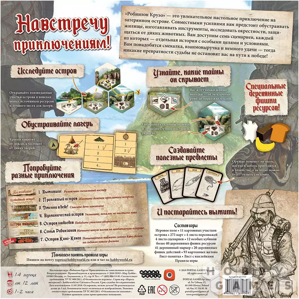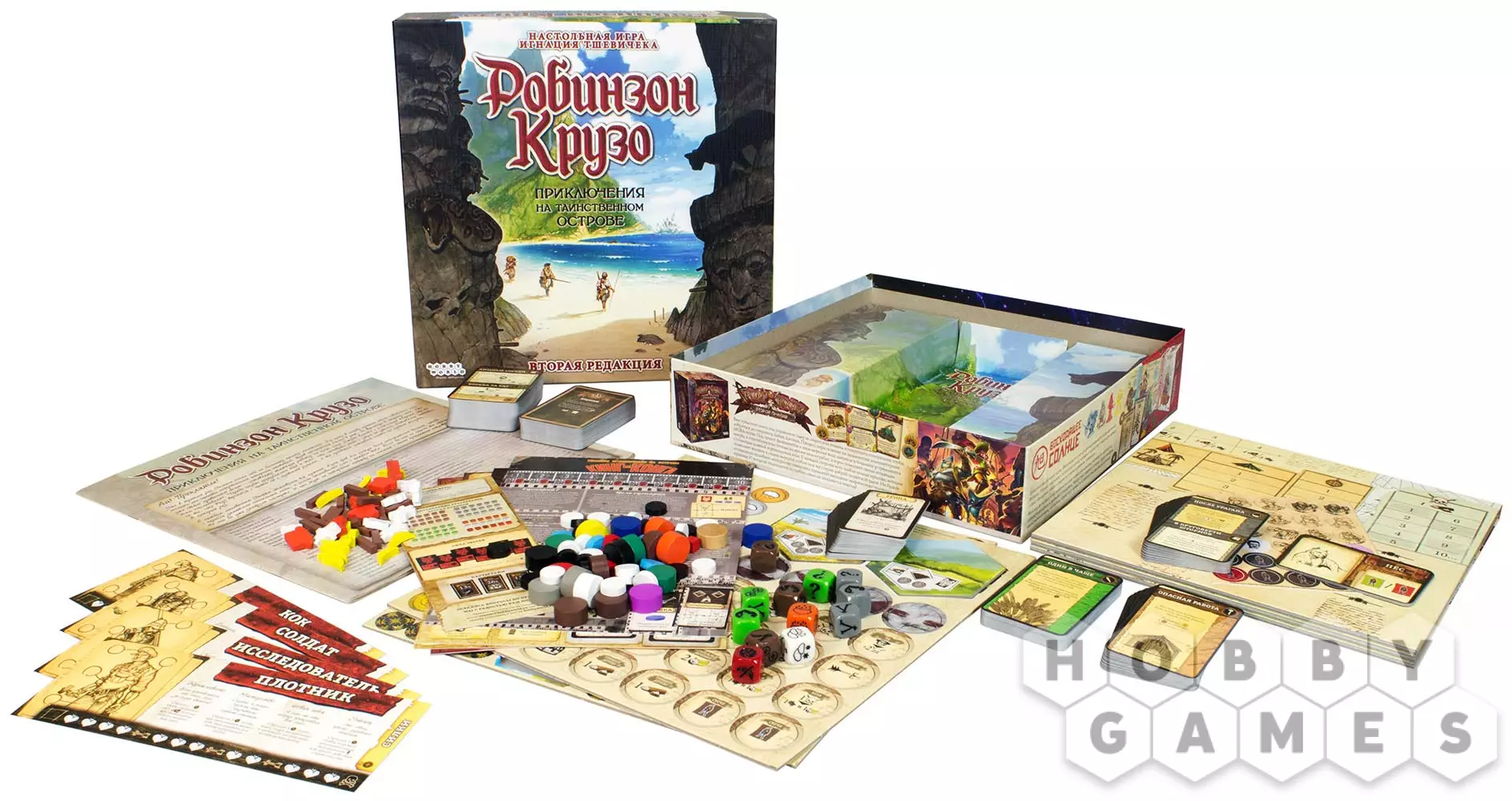 "Робинзон Крузо: Приключения на таинственном острове. Вторая редакция" – это кооперативная настольная игра, в которой одному игроку или команде до четырёх человек предстоит превозмогать тяжести жизни на необитаемом острове, всеми силами выживать, разгадывать тайны и пройти все семь сценариев, каждый из которых предложит уникальный игровой процесс. Сценарии можно объединить в большое приключение-кампанию, тогда ваше путешествие в мир игры станет ещё увлекательнее!