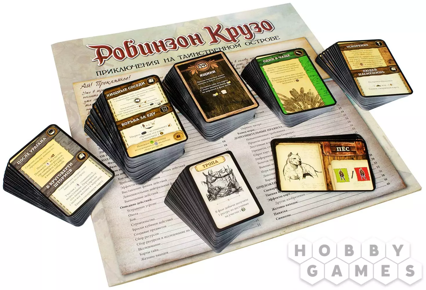 В "Робинзона" можно играть и вдвоём, а можно даже одному. В этом случае правилами игры предусмотрены специальные помощники – Пятница и верный пёс. А ещё игра предлагает усложнённые и упрощённые варианты игры, так что вы сможете настроить сложность под себя.