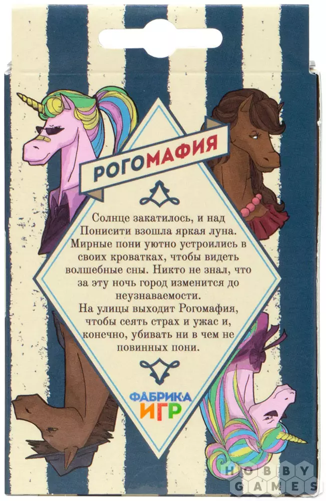 В мире животных свои разборки. Например, в Понисити иногда происходят массовые убийства мирных пони. Город пытается уснуть, но у него это плохо получается, ведь по улицам бродит опасная Рогомафия, вселяющая в каждого простого парнокопытного вселенский ужас! Задача игроков – как можно скорее вычислить всех членов бандитской группировки, иначе к утру могут проснуться не все... Помогите Понисити в борьбе с преступностью!