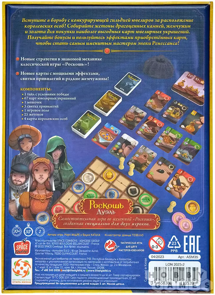 Название настольной игры "Роскошь: Дуэль" говорит само за себя: она продолжает серию оригинальной "Роскоши", но теперь в дуэльном формате. И это не единственное её отличие. В игру были добавлены 3 уникальных условия победы, а также абсолютно новый тип жетонов – жемчуг! Карты драгоценностей обзавелись различными способностями, которые дадут вам новые возможности и ощутимое преимущество перед конкурентом.