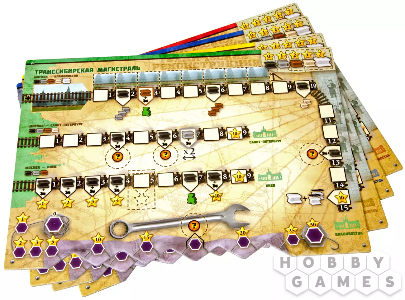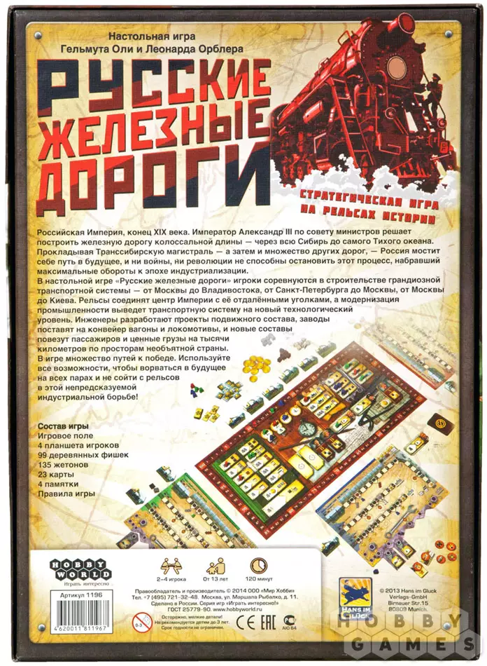 "Русские Железные Дороги" – это экономическая настольная игра для 2-4 игроков, в которой вы становитесь промышленником и управляете строительством на всех его этапах: прокладываете рельсы; заказываете новые поезда; нанимаете инженеров и железнодорожников. Если вы готовы взять на себя столь ответственную задачу, то вперёд, время не ждёт!