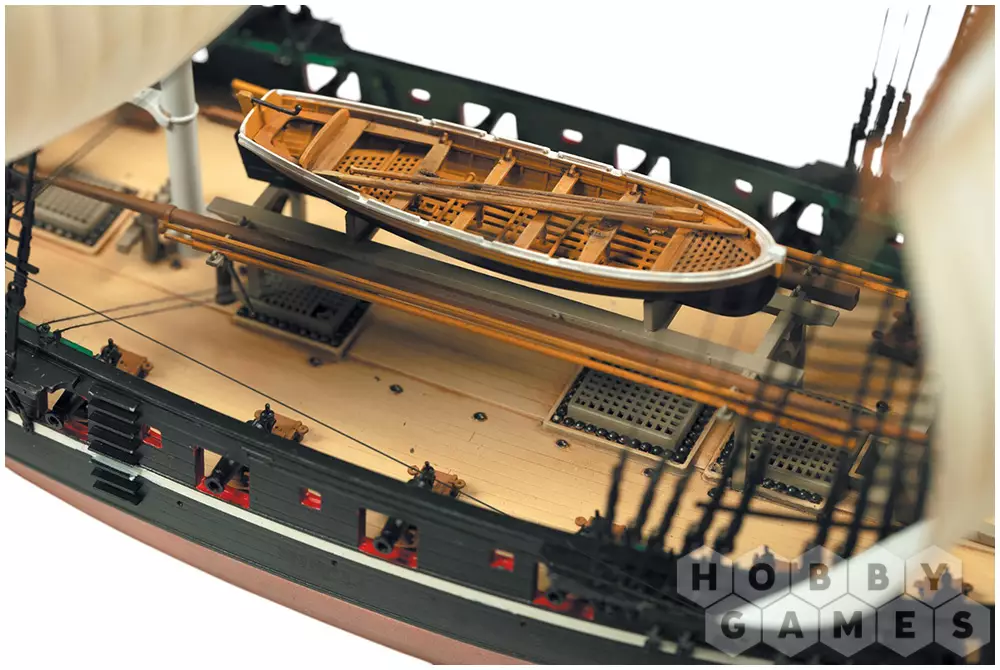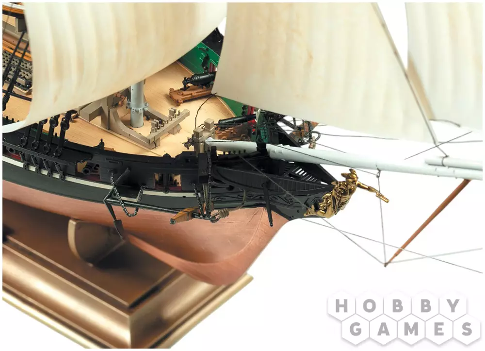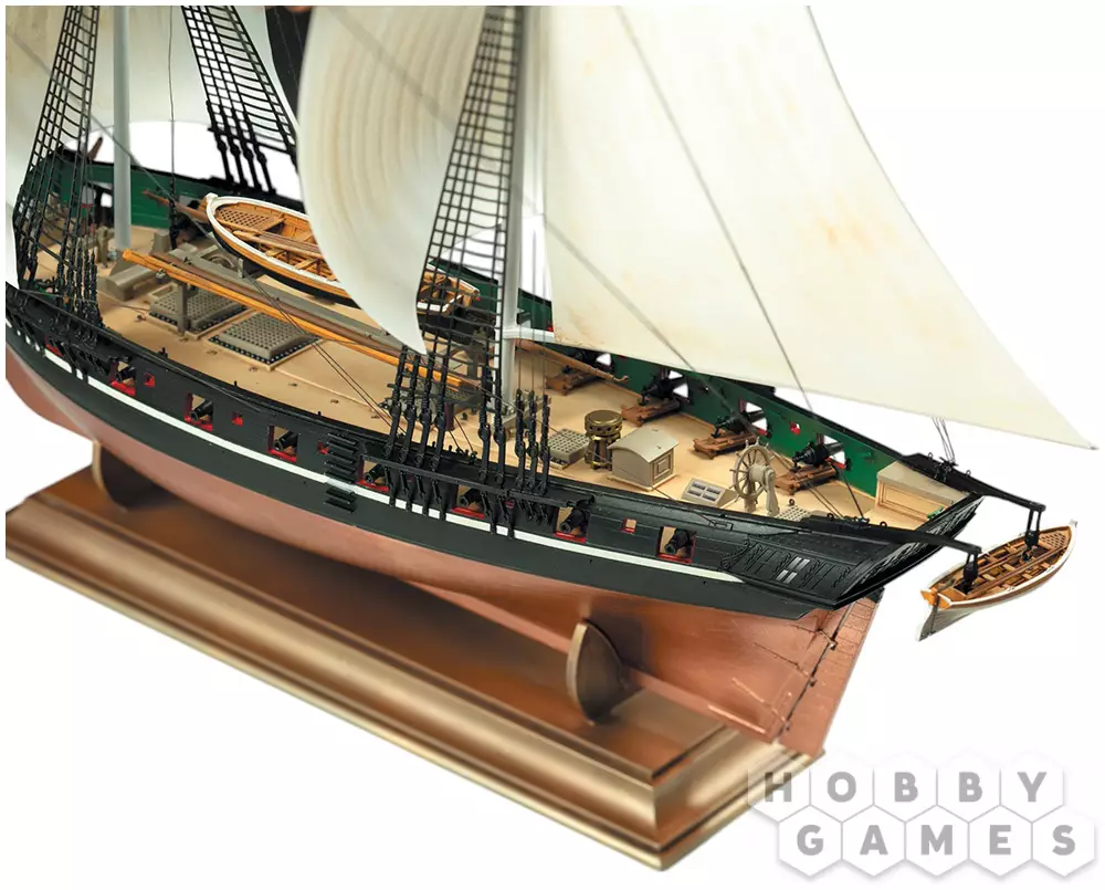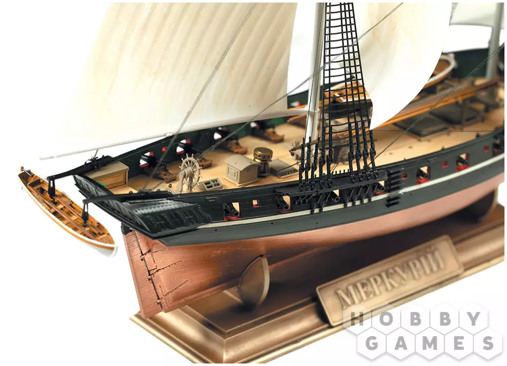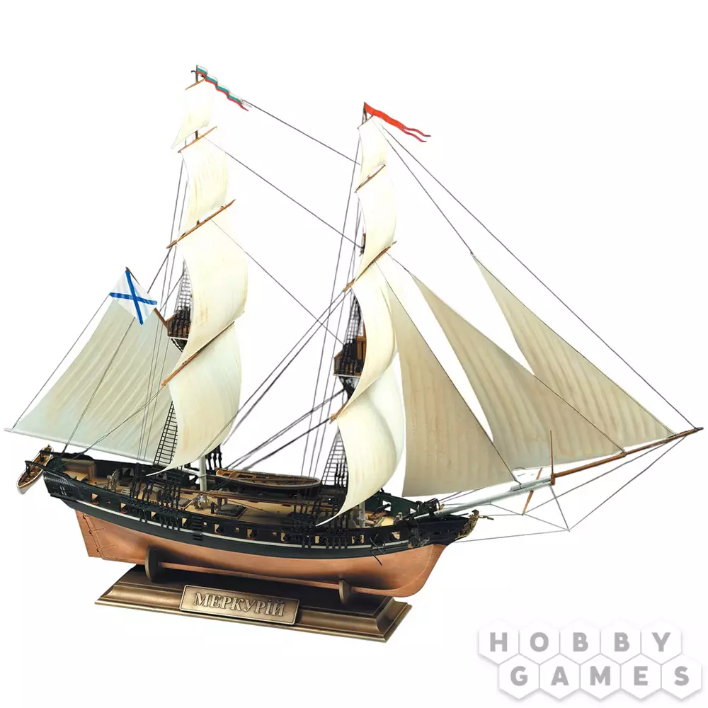 Сборная модель русского брига "Меркурий" в масштабе 1:100 – это точная копия одного из самых известных кораблей Русского флота начала XIX века. Заложенный в Севастополе в 1819 году, бриг "Меркурий" был разработан для охраны Кавказского побережья и выполнения дозорных задач. Оснащённый 20 пушками, он мог двигаться как под парусами, так и на вёслах. Одним из самых запоминающихся моментов в истории "Меркурия" стал бой в 1829 году во время Русско-турецкой войны. Во время сторожевой службы у Босфора бриг заметил турецкую эскадру из 14 судов и, несмотря на численное превосходство противника, принял бой с лучшими турецкими кораблями: 110-пушечным "Селимие" и 74-пушечным "Реал-бей". Благодаря искусным манёврам, "Меркурий" уклонялся от залпов врага, в то время как сам наносил удары по парусам и рангоуту турецких судов. Бой продолжался около четырёх часов и закончился тем, что турецкие корабли были вынуждены отстать. Несмотря на полученные повреждения – 22 попадания в корпус и более 300 в паруса и такелаж – бриг смог присоединиться к своей эскадре. Экипаж "Меркурия" был награждён за проявленный героизм, а сам бриг получил Георгиевский флаг и вымпел.