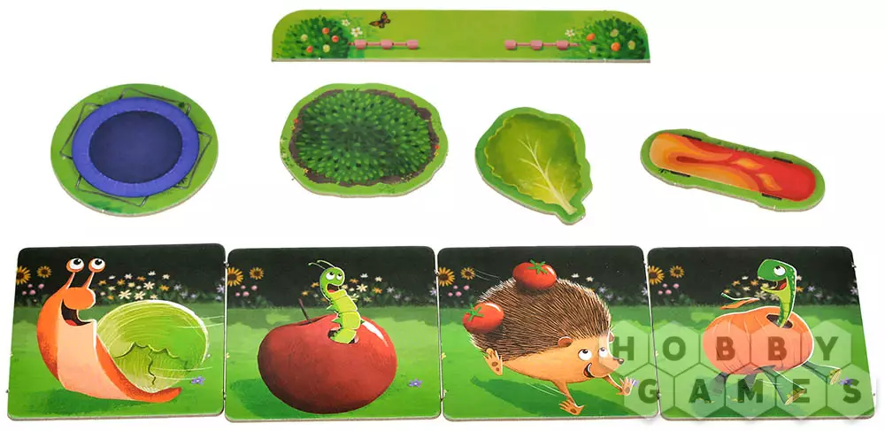 Сначала вы создаёте гоночную трассу! Вы выкладываете в ряд волшебные плитки сада, а в конце ставите калитку – это финиш. Каждый из вас тайно выбирает себе одного любимого зверька (черепаху, ёжика, улитку или гусеницу), за которого будете болеть. Все четыре фигурки ставятся на старт. Готово? Тогда вперёд, к побегу!