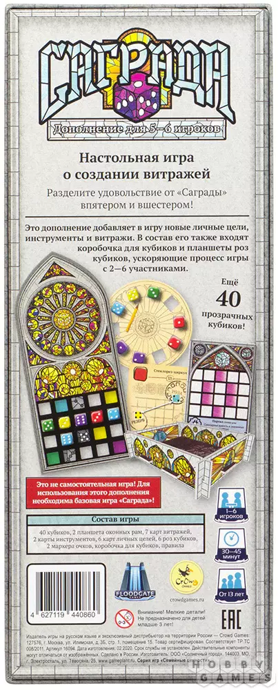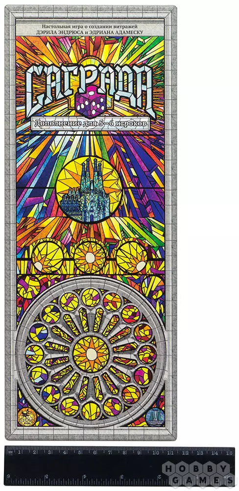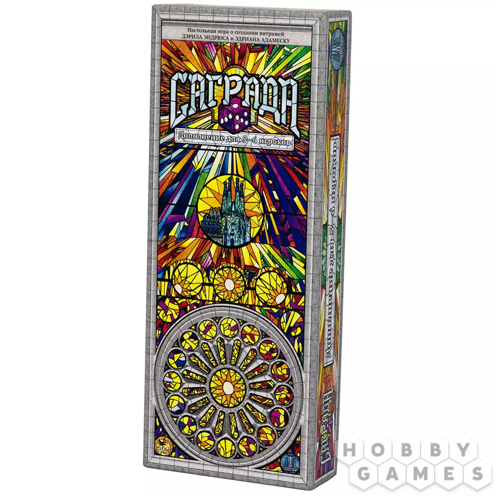 "Саграда. Дополнение для 5-6 игроков" предлагает разделить удовольствие от базовой версии впятером и даже вшестером! В коробке с дополнением вы найдёте новые витражи, инструменты, а также карты личных целей, которые, к слову, добавляются в игровой процесс только с шестью участниками. Чтобы ускорить игровой драфт, используйте новые розы кубиков. Плюс ко всему вы найдёте два маркера очков, ещё 40 прозрачных кубиков, а также коробочку для них.