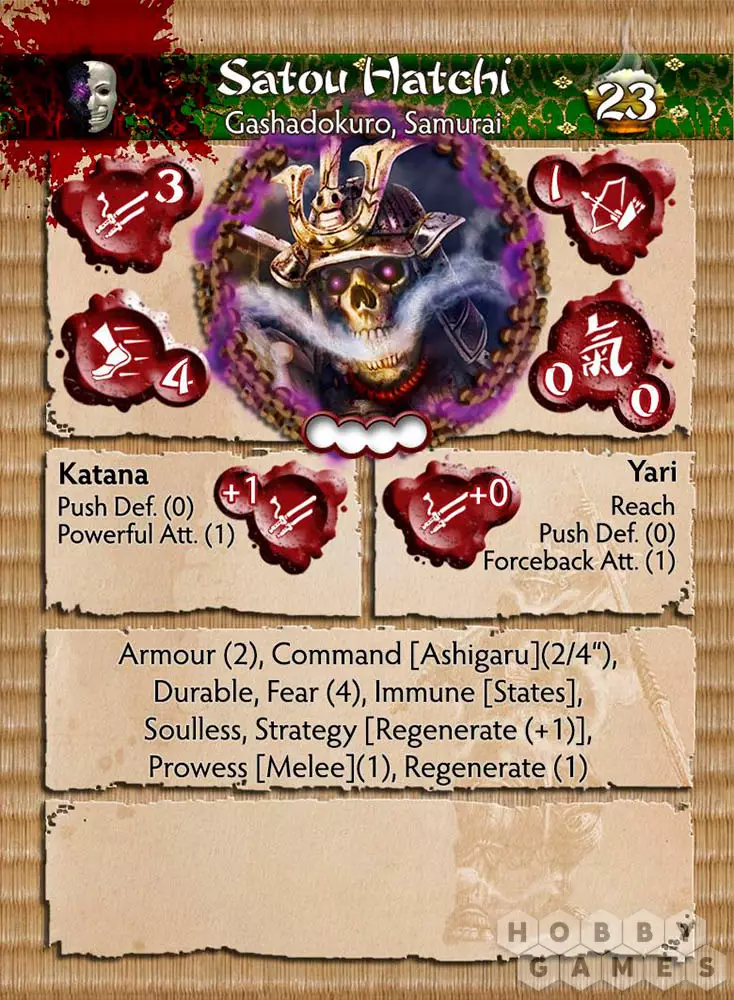 Для игрока Cult of Yurei Gashodokuro предлагает превосходную переднюю линию моделей, которых очень тяжело быстро победить. Сато Хатчи делает еще один шаг вперед, поскольку он более вынослив, чем обычный скелет, и наносит приличный урон по сравнению с другими ему подобными. Он ответственно служил при жизни, ещё яростнее служит после смерти.