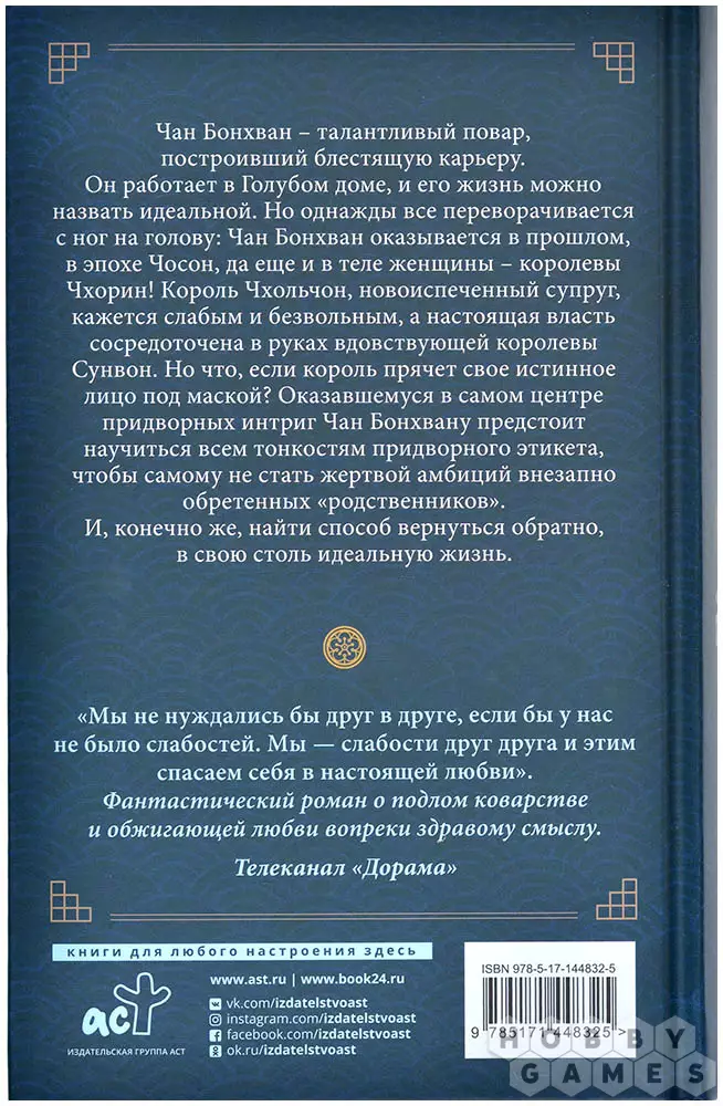 Перед вами сценарий к завораживающей дораме "Королева Чхорин". Привычная многим история, когда персонаж из настоящего времени неожиданно попадает в прошлое, постепенно изучая его и ища пути возвращения. Чан Бонхван, повар с блестящей карьерой, живёт идеальную жизнь и ни в чём себе не отказывает. Но однажды мир переворачивается с ног на голову, и герой обнаруживает себя мало того, что в эпохе Чосон, так ещё и в женском теле самой королевы Чхорин! Сценарий интригует с первых же страниц, и очевидно, что его ждёт немало приключений. Свыкнется ли Чан Бонхван с новым статусом или всё же найдёт путь домой?