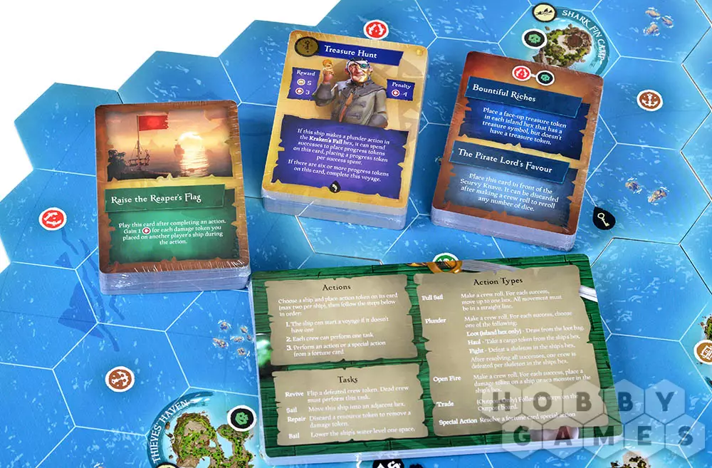 Арр! Станьте капитаном своей судьбы с настольной версией захватывающей приключенческой видеоигры Sea of Thieves. Бороздя бескрайние просторы океана, игроки соперничают между собой в стремлении стать настоящими пиратскими легендами. Ваш путь усеян заданиями, испытаниями и коварными противниками, с победой над которым ваша репутация поднимется до небывалых высот! Больше сражений, золота и рома!