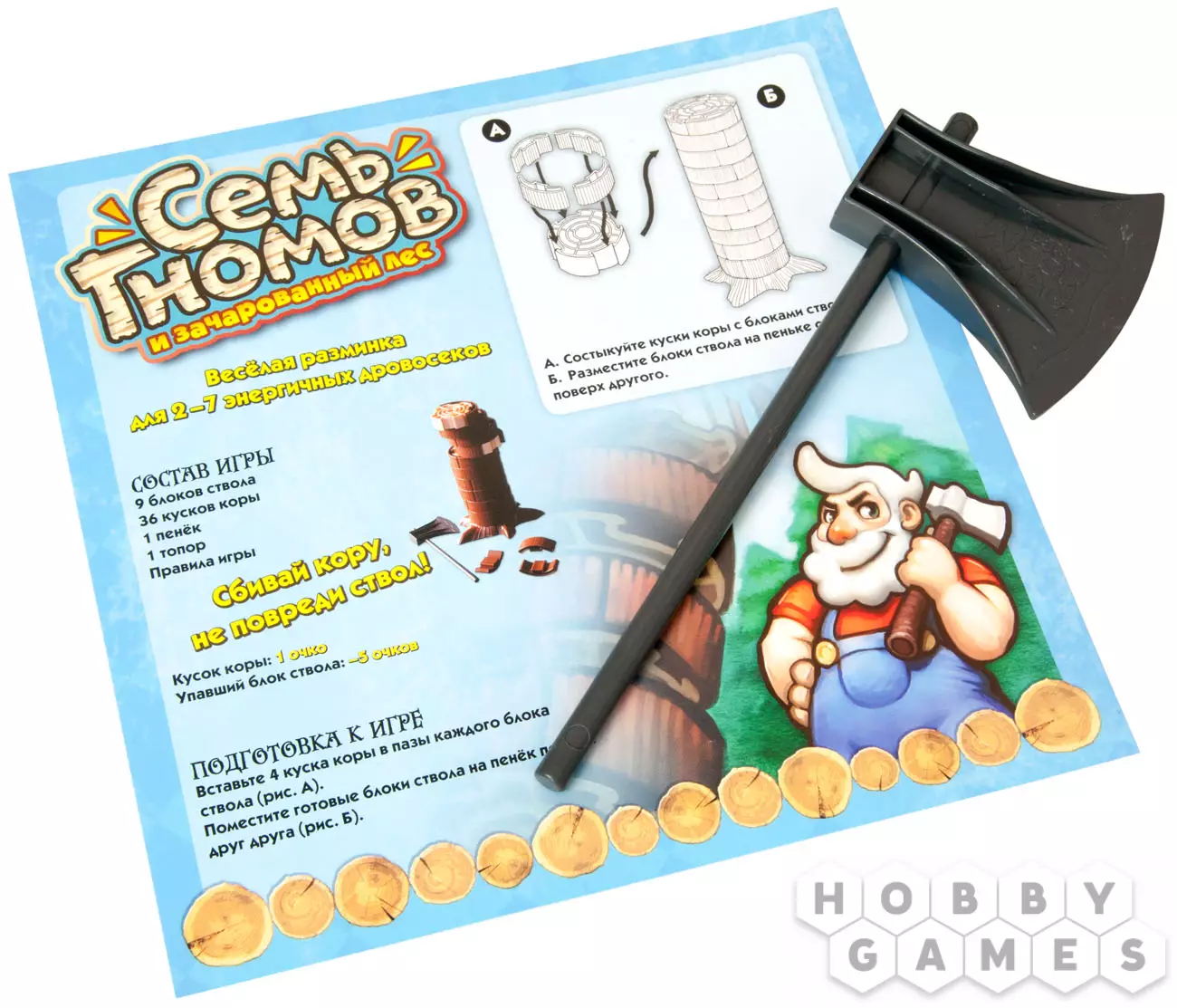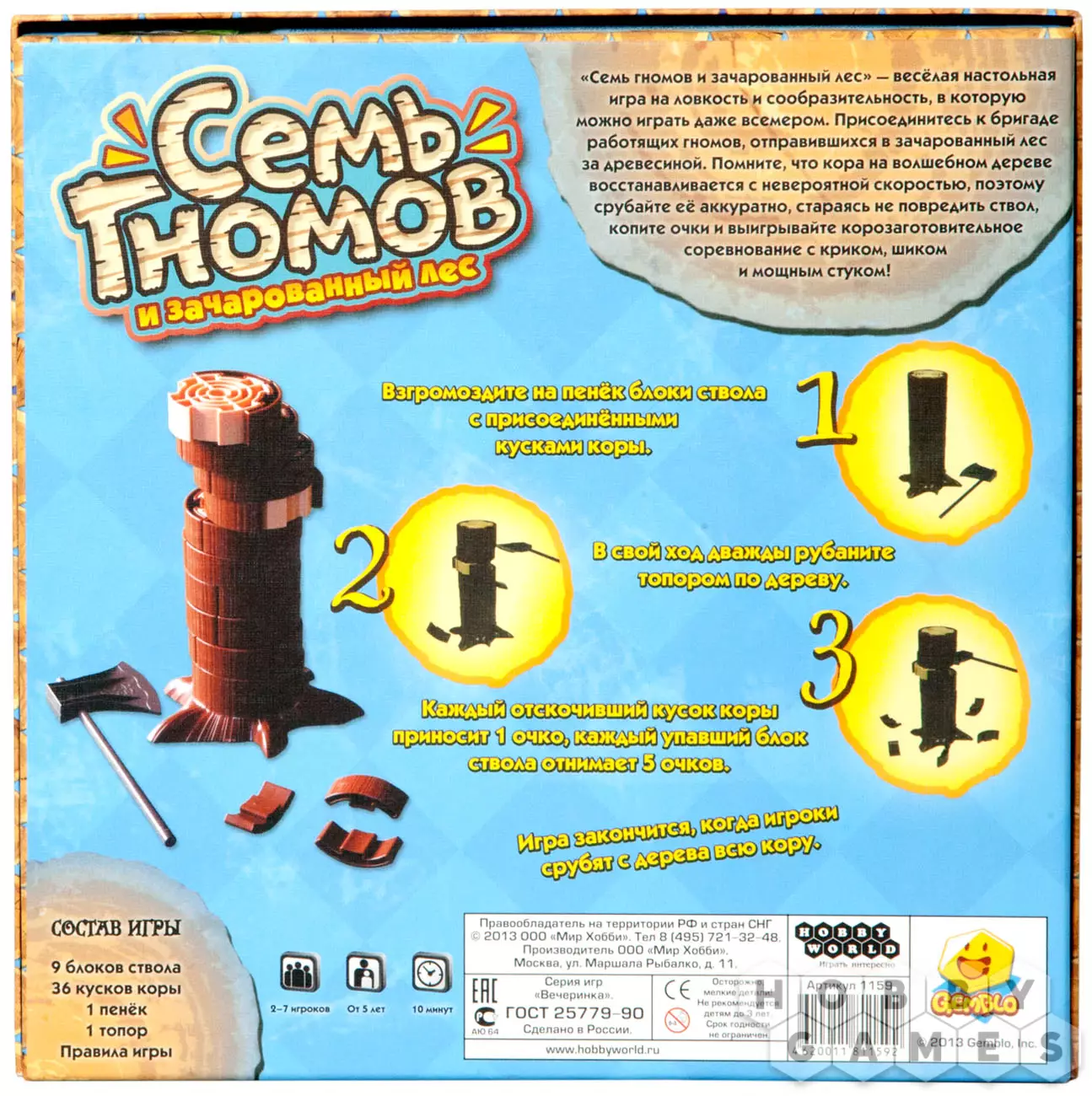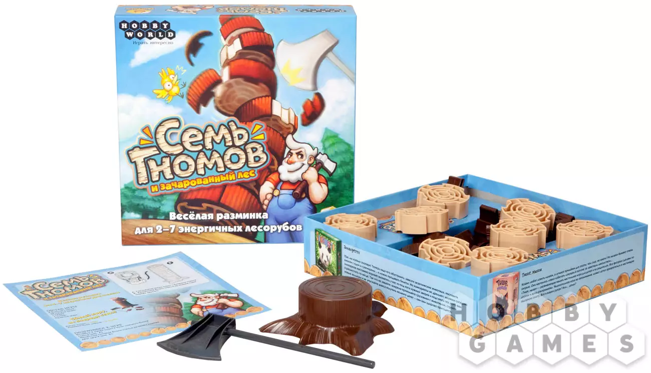 "Семь гномов и зачарованный лес" – веселая и увлекательная игра на ловкость и находчивость. Простая и интересная, в неё можно играть всем, от мала до велика. И размер компании позволяет собрать всю семью или кучу друзей – играть можно вдвоем или даже всемером! Собирайтесь в поход с работягами-гномами за волшебной корой с деревьев зачарованного леса. Но помните, хоть кора отрастает быстро, деревьям нельзя наносить вред! Поэтому рубите аккуратно.