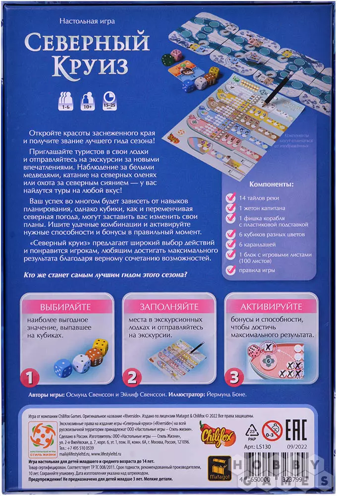 "Северный круиз" – игра с механикой Roll'n'Write, то есть вам предстоит бросать кубики и, в зависимости от выпавших значений, прокладывать наиболее оптимальные маршруты на вашем личном листе. Только в отличие от других игр с данной механикой, тут вас ждёт модульное игровое поле, которое перед началом игры вы составляете как душе угодно. Это многократно повышает реиграбельность, поэтому ни одна партия не будет похожа на другую. А простые правила и количество игроков от 1 до 6 позволят сыграть в игру любым составом в любое время.