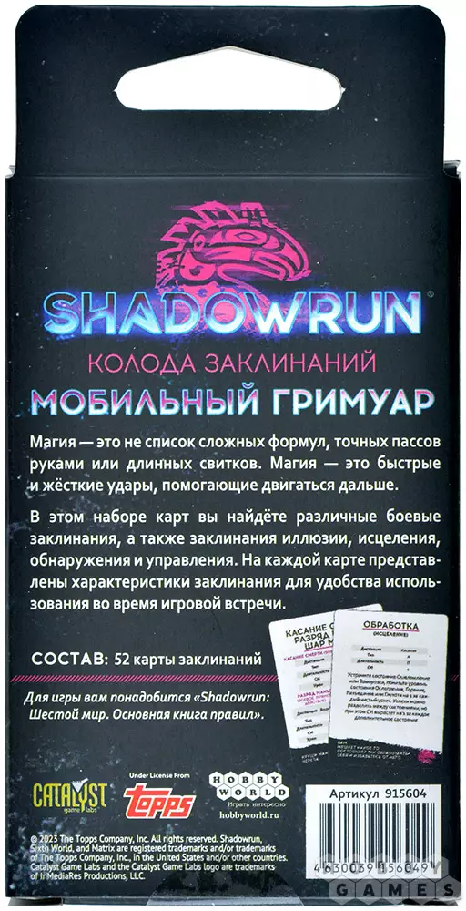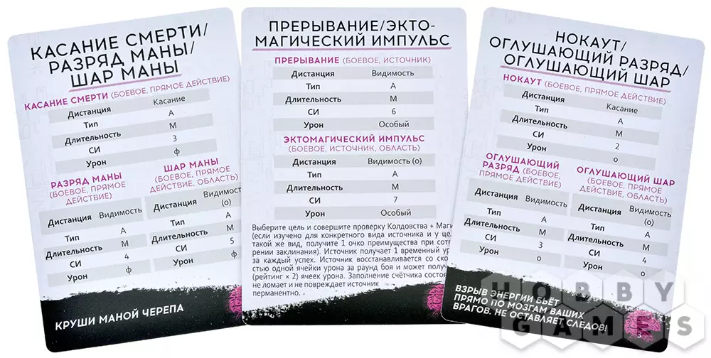 Данный набор содержит 52 карты различных заклинаний, включая как боевые, так и заклинания иллюзии, исцеления, обнаружения и управления. На картах вы найдёте полезную информацию, что позволит всегда быть готовым к потасовке: тип и дистанцию заклинания, его особенности и прочее. Удобно использовать в ходе партии как игрокам, так и мастеру!