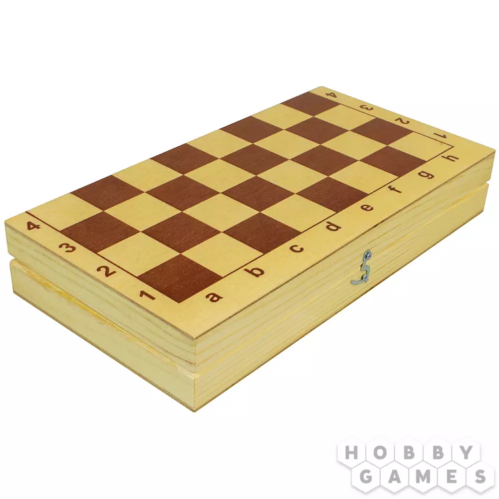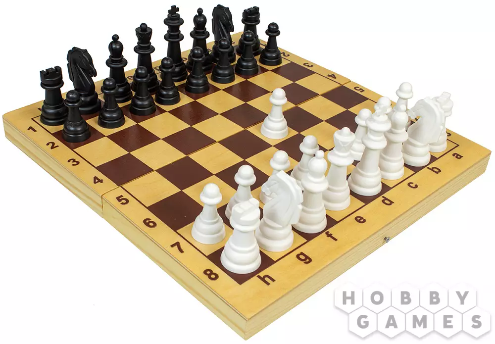 Доска сделана из дерева и покрыта лаком, фигуры сделаны из пластика.