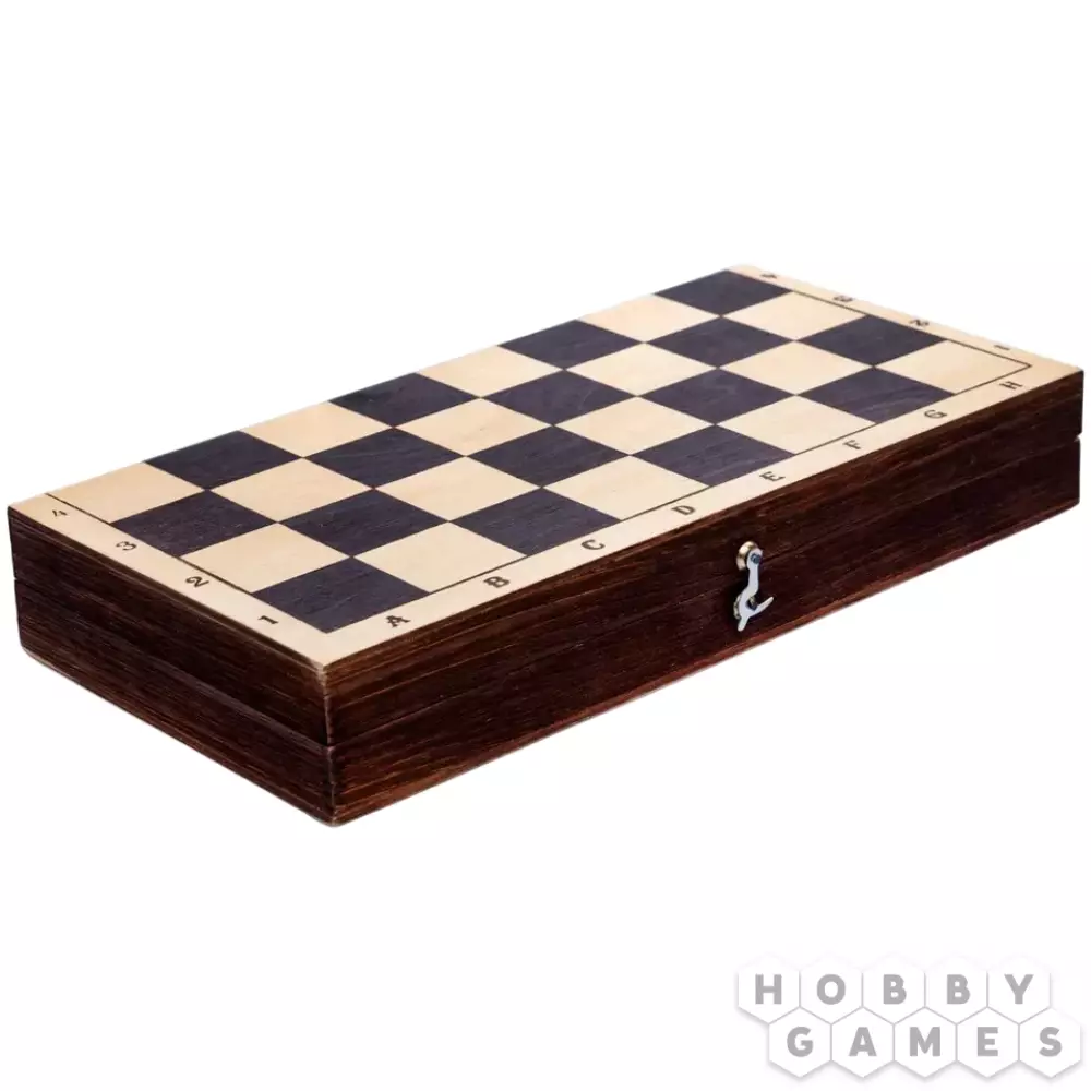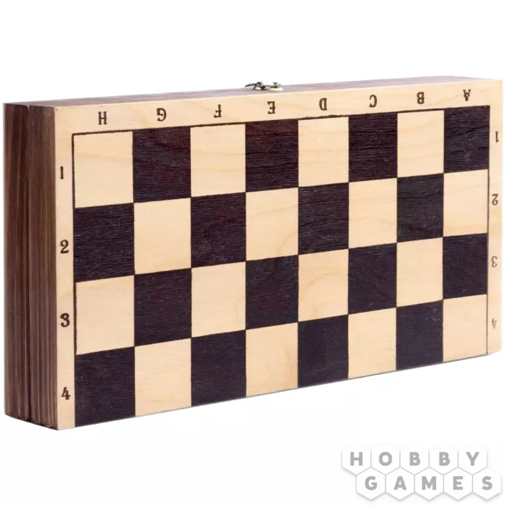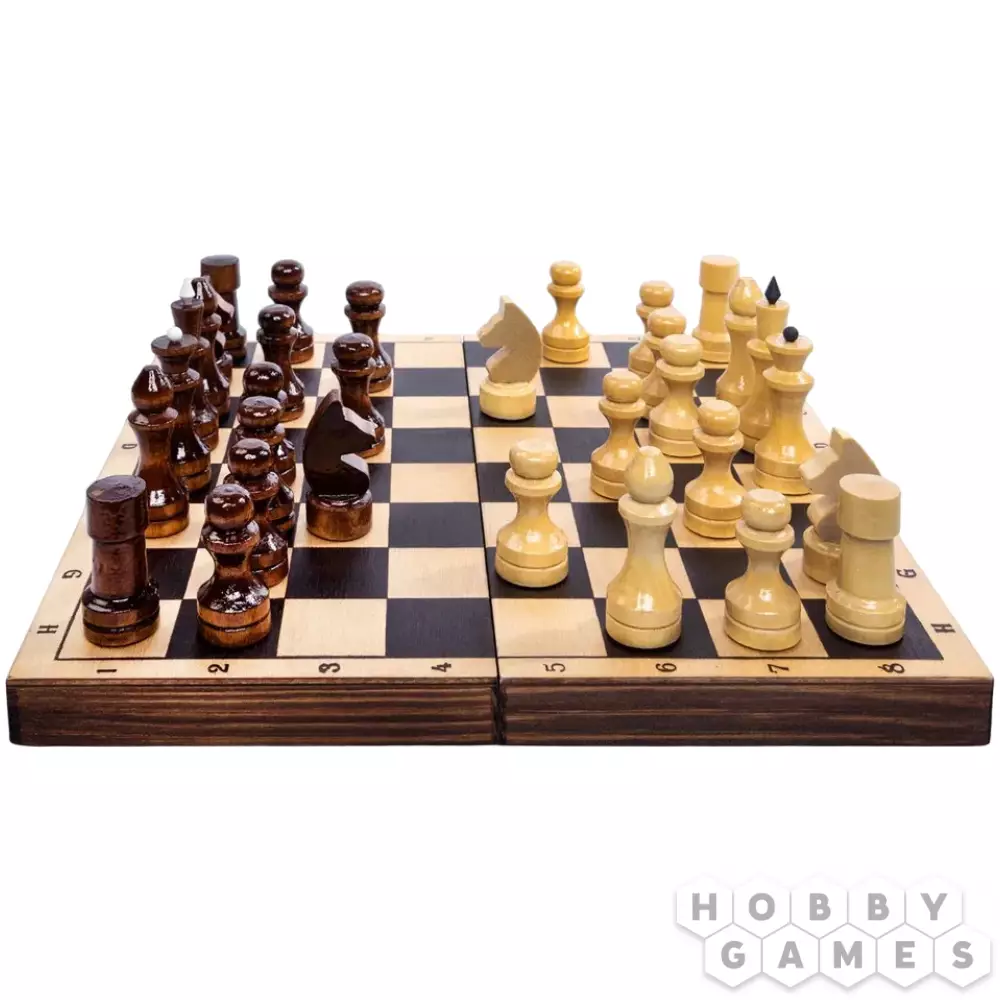 Доска и фигуры сделаны из дерева и покрыты лаком.