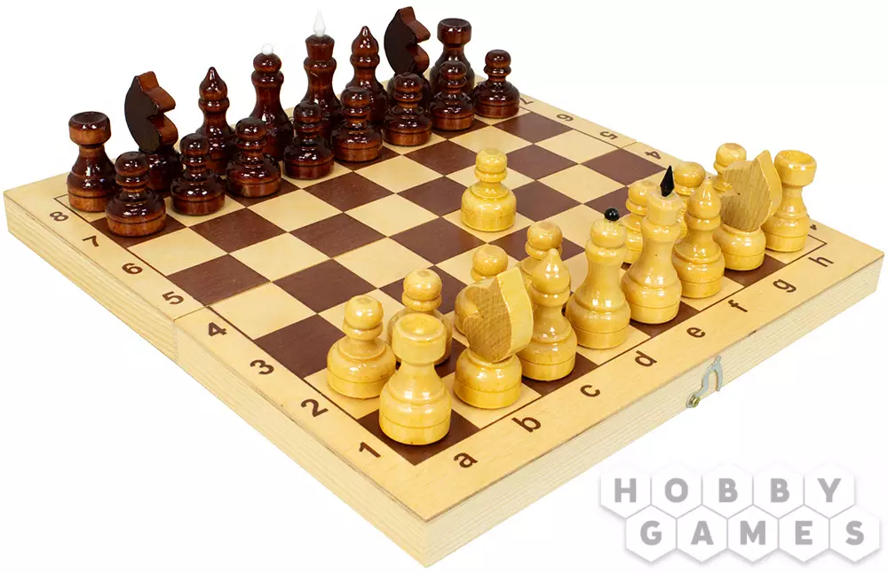 Доска и фигуры сделаны из дерева и покрыты лаком.