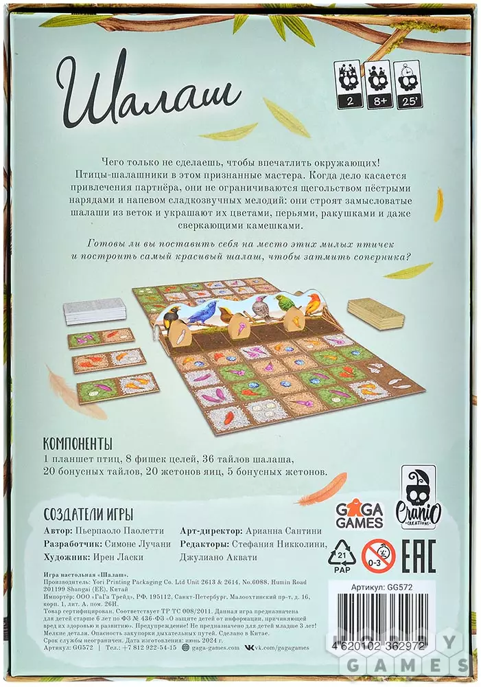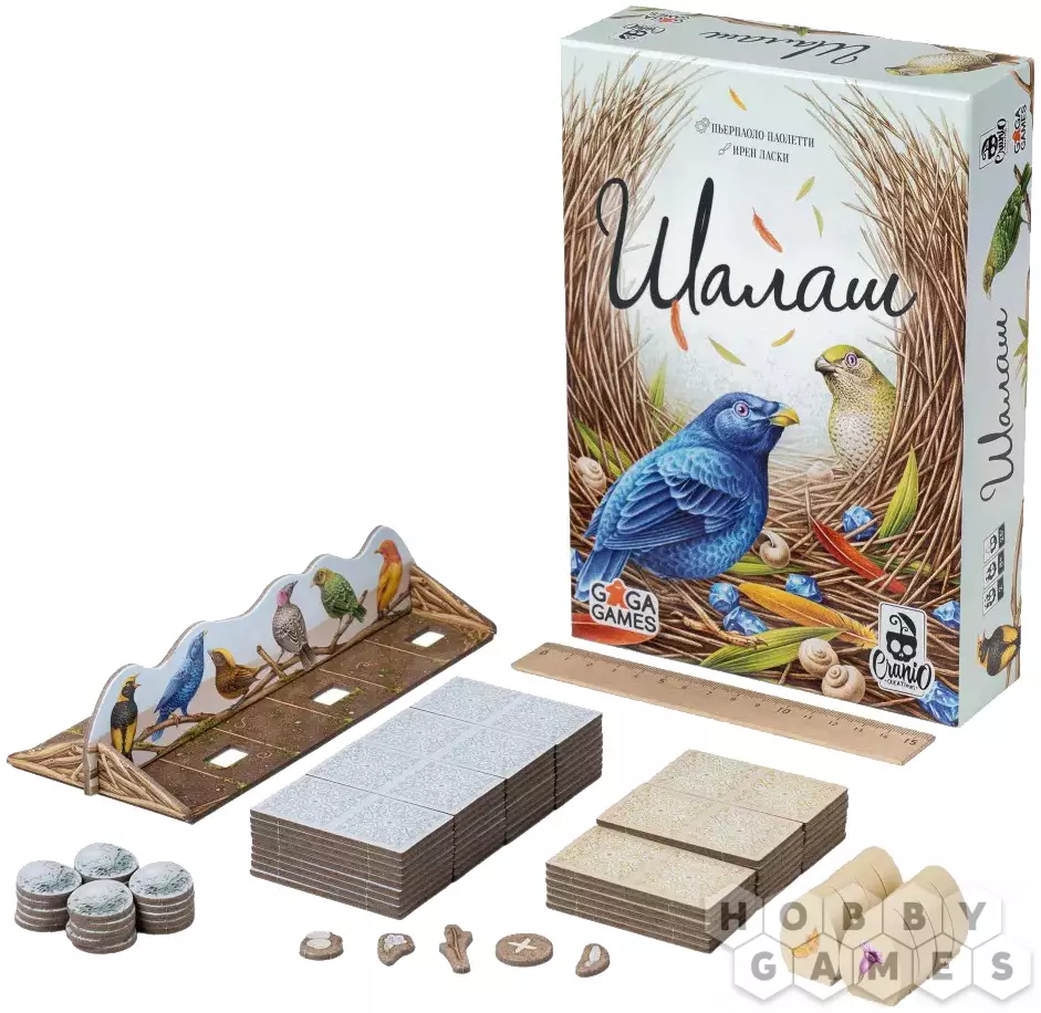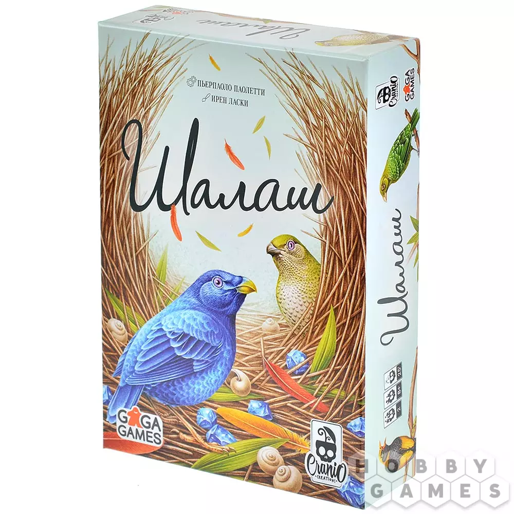 "Шалаш" – это увлекательная и милая дуэльная игра, в которой вы станете птичкой-шалашником и бросите все свои силы на то, чтобы построить самый красивый и впечатляющий шалаш. Используя веточки, перья и цветы, вы будете украшать своё строение, соревнуясь с соперником в мастерстве и хитрости. Своими действиями вам нужно будет одновременно набрать победные очки, выполнить цели и запутать планы оппонента. Согласитесь, та ещё задачка! Тем более что вам известна лишь часть ваших целей, а соперник не собирается уступать так просто и тоже плетёт свои интриги... Активируйте свою хитрость и интеллект и побеждайте!