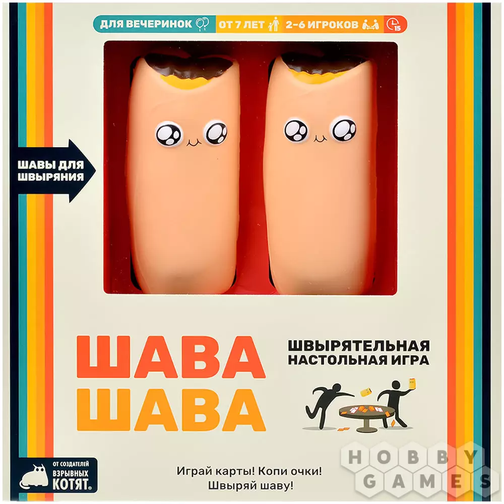 "Шава Шава" – это новая безумная настольная игра от авторов "Взрывных котят". В ней на протяжении двух раундов вам предстоит вербовать шаурменов, собирая наборы из трёх одинаковых карт – именно они будут приносить победные очки. Колода, откуда вам придётся тянуть карты, – это сброс игрока по соседству, поэтому не ждите хоть какого-то порядка в этом сумасшедшем хаосе! Игра бы не называлась "Шава Шава" будь в ней только карточки: в центре стола будут лежать 2 прекрасные мягкие шавы, которые только и ждут розыгрыша особых карт, чтобы полететь кому-нибудь в личико... Они в самом деле мягкие и ничего не пачкают, так что не нанесут вреда ни вам, ни вашей мебели (но лучше всё-таки не целиться в голову).