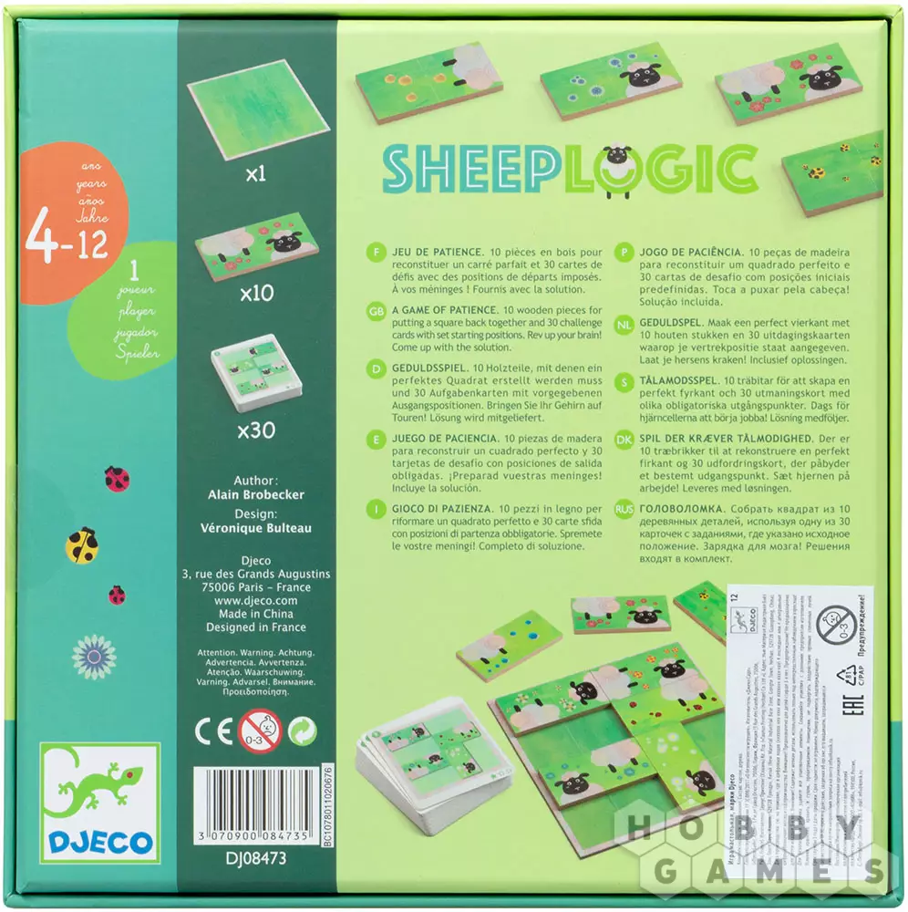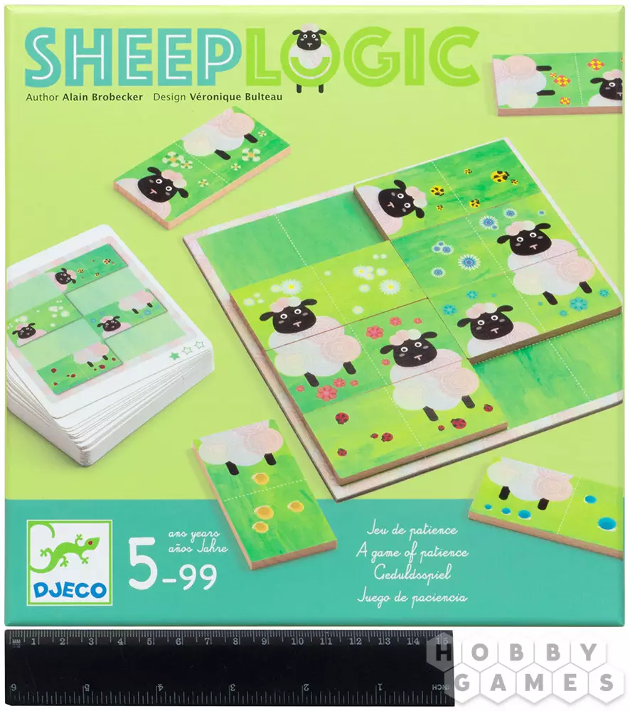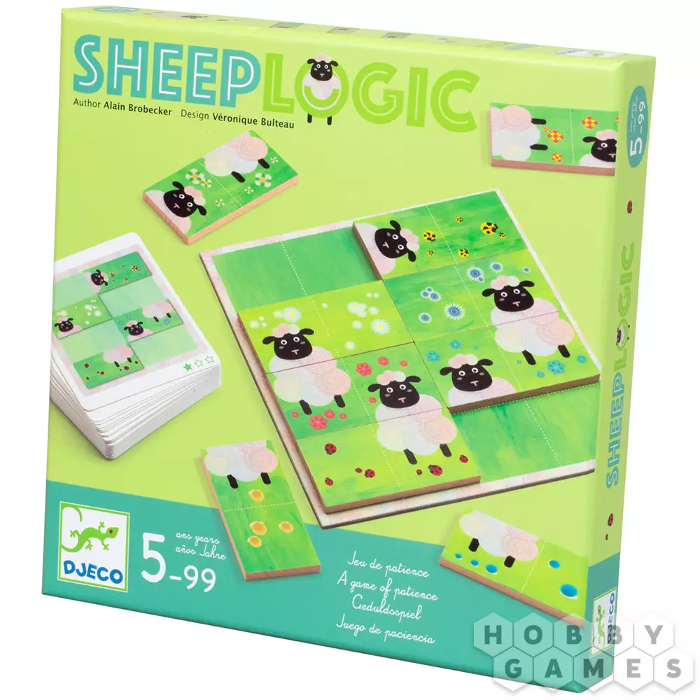 Sheep Logic – это увлекательная настольная игра для одного. Игровой комплект состоит из шаблона, десяти деревянных домино и карточек с заданиями. Задания есть простого, среднего и сложного уровня. Используя 8 из 10 домино нужно собрать картинку с задания. На каждой костяшке домино изображены части овечек и травка. Для каждого задания есть только одно верное решение. Прокачайте логику и пространственное мышление на овцах!
