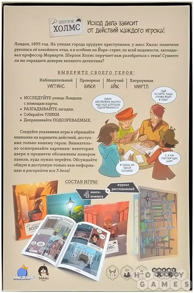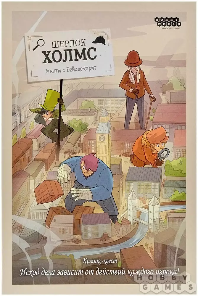В комикс-игре "Шерлок Холмс: Агенты с Бейкер-стрит" вы примерите на себя роль одного из четырёх персонажей, каждый из которых обладает собственными уникальными характеристиками. Вам предстоит самое настоящее путешествие по улицам Лондона в поисках зацепок и улик. В коробке вас ждёт 4 комикса, каждый из которых относится к своему герою и содержит 3 дела. Их-то вам и предстоит распутать! А ещё в составе вы найдёте журнал расследований, содержащий карту города и связанный со всеми комиксами.