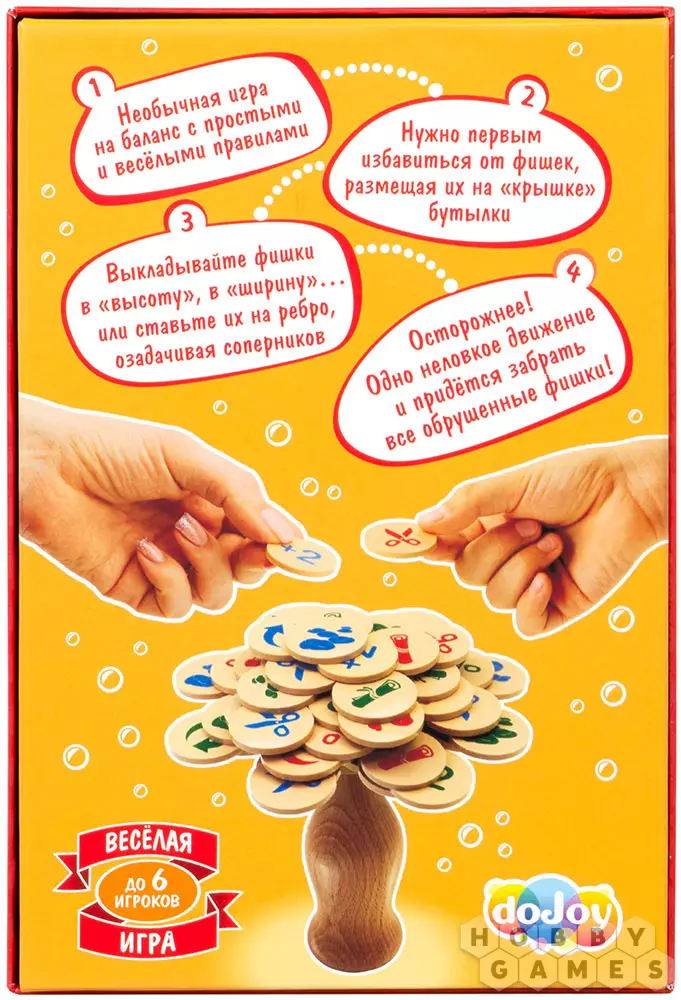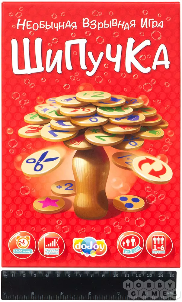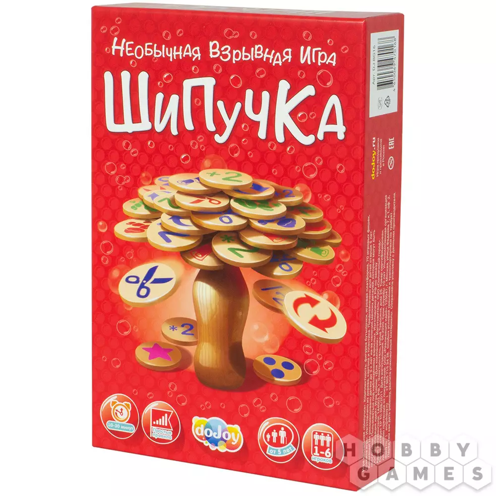 "Шипучка" – это невероятная активная и забавная настольная игра для любой компании. Процесс игры будет интересен как взрослым, так и детям. В "Шипучке" авторы объединили классическую механику домино с "камень, ножницы, бумага" и добавили свои наработки. Процесс игры незатейлив и прост. Игроки поочерёдно размещают свои фишки на деревянной бутылке с одной единственной целью – первым избавиться от всех фишек на руке. На каждой фишке есть специальные картинки и обозначения, которые имеют преимущества над другими и вынуждают игроков совершать те или иные действия. Чтобы победить, вам придётся объединить ловкость и стратегию, хитрость и память. В игре необходимо как просчитывать ход, так и твёрдой рукой выкладывать фишки. Но удача превыше всего!