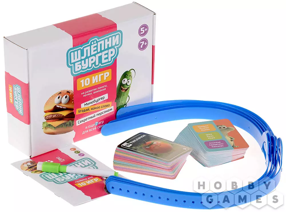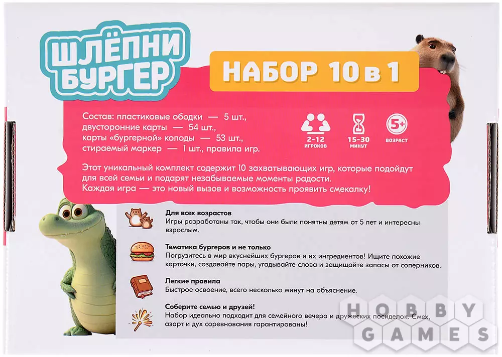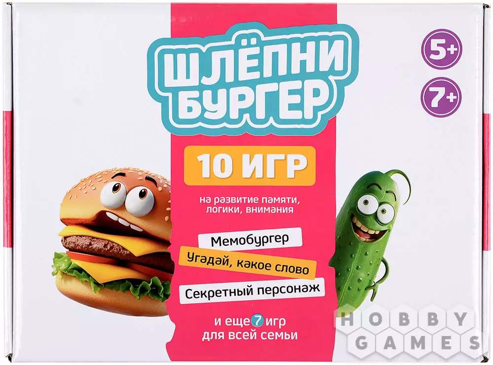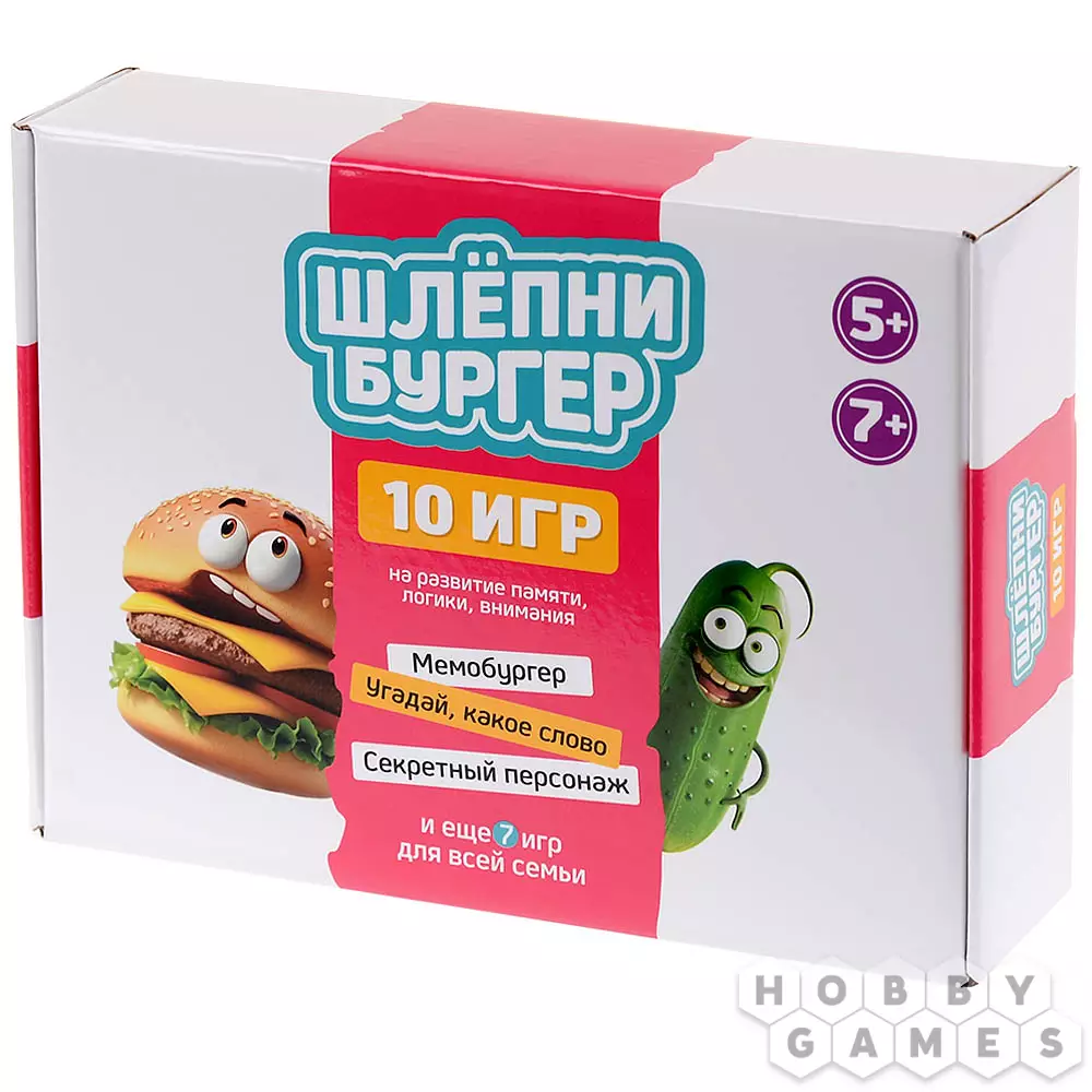 "Шлёпни бургер" – это идеальный вариант для тех, кто мечтает получить сразу множество настолок, упакованных в одну небольшую коробку. Внутри вас ждёт целая коллекция из 10 разнообразных игр, каждая из которых построена на популярных и увлекательных механиках. Они не только подарят массу удовольствия, но и помогут развить важные навыки, такие как логическое мышление, память, стратегическое планирование и умение быстро принимать решения.