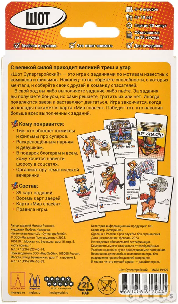 Играть в "Шот Горячительный" отнюдь не сложно, но необычайно весело! Игроки по очереди совершают ходы, вытягивая карты: на каждой описаны определённые супергеройские задания. Придётся снимать видео, танцевать и совершать всевозможные смешные действия – но делать это не обязательно. Если вы не хотите выполнять задание, вы можете выпить и передать карту игроку слева. Он, в свою очередь, тоже должен решить, выполнить задание или передать карту дальше. Карта будет переходить по кругу до тех пор, пока кто-то не выполнит её условие или пока она не вернётся к вам.