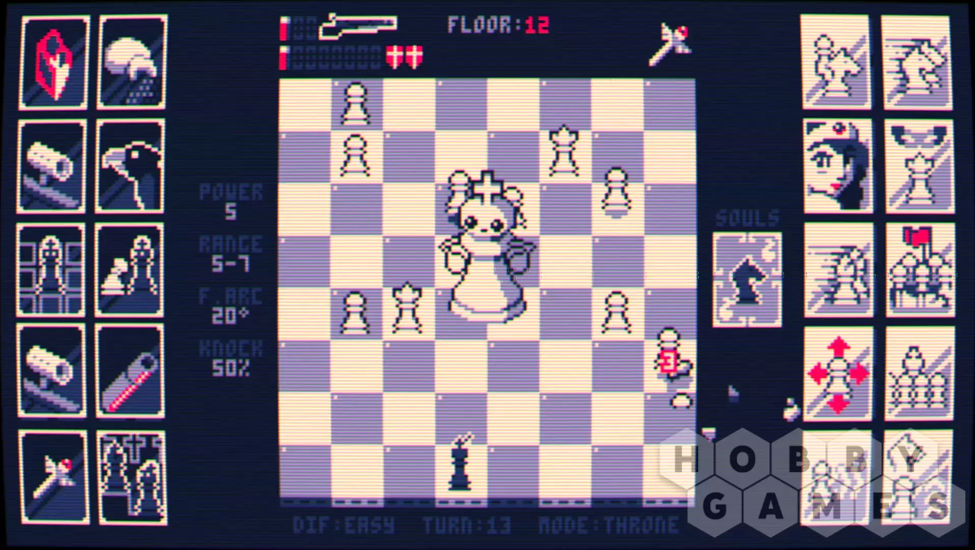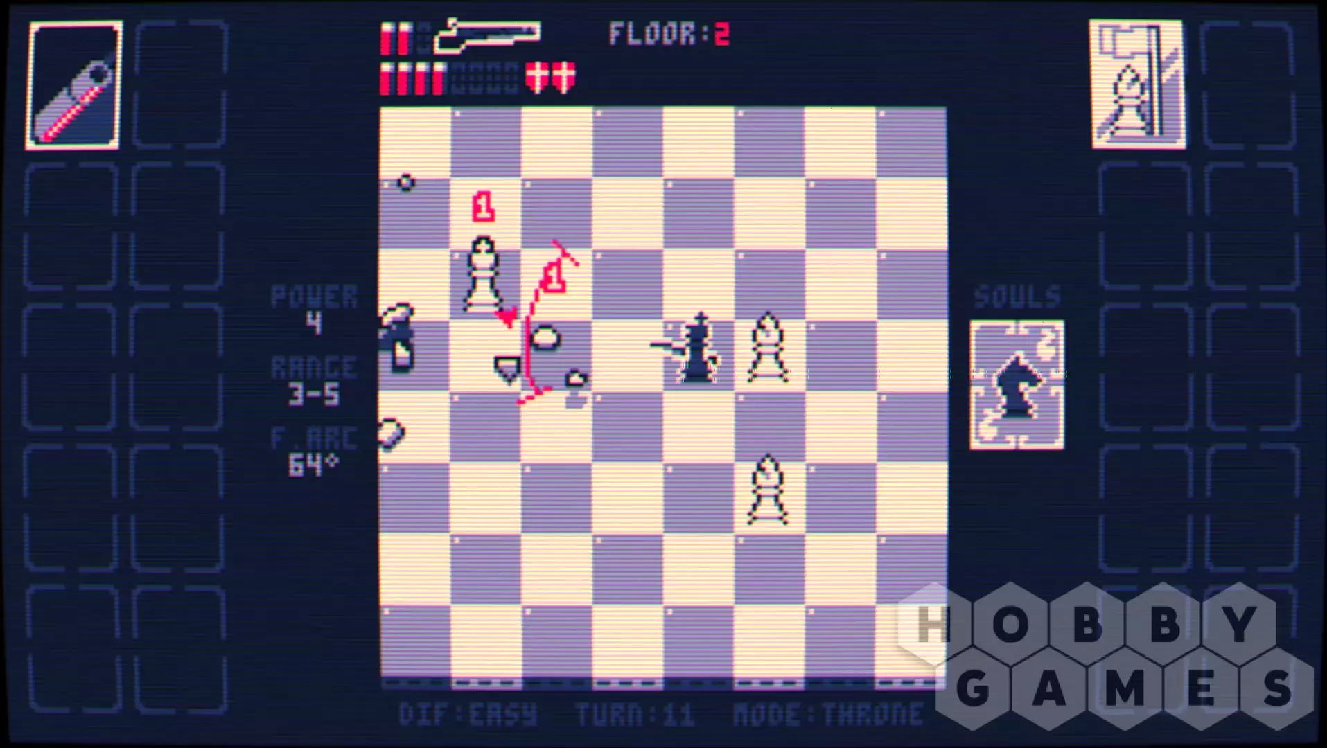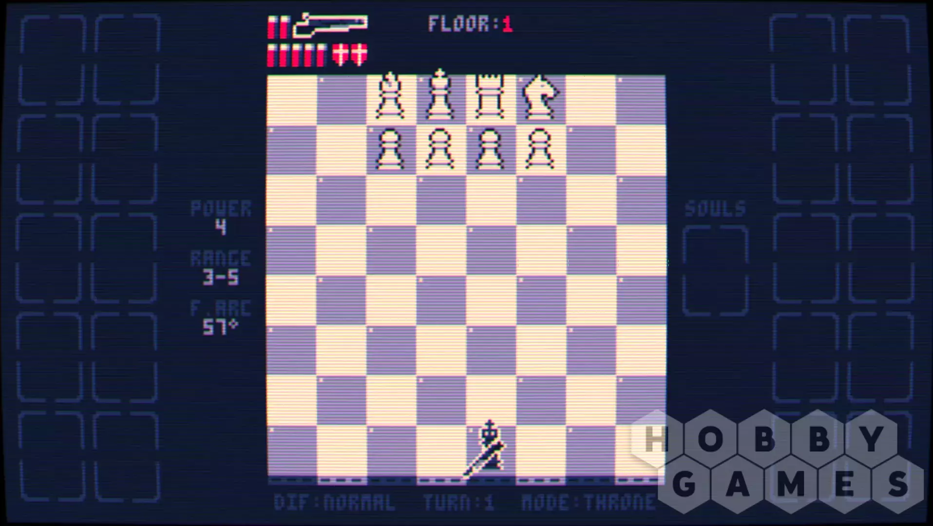 На каждом ходу король может двигаться или стрелять по фигурам. После выстрела он тратит действие на перезарядку дробовика. Не дайте поставить вам шах и мат и убейте вражеского короля, чтобы пройти этаж. После каждого этажа вы сможете выбрать между двумя случайными парами карт: одна улучшает вашего короля, другая — сторону врага. Выбирайте мудро, зачищайте этажи, и, возможно, вам удастся отвоевать свое королевство.